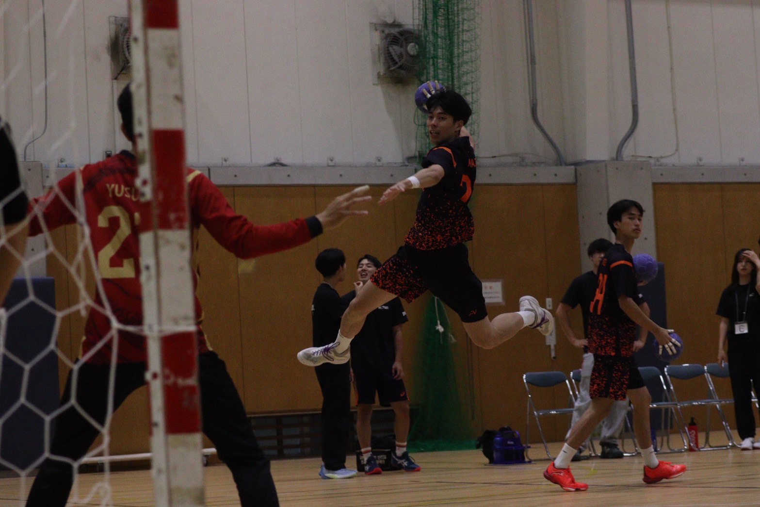 前戦で優勝を決めたこともあり、あまり見慣れないメンバー中心で挑んだこの一戦。開始からつまづくかとも思われたがその心配を振り払うようにわずか36秒で#2加崎條一郎(社2)がチーム初ゴールを決めると、それに続くように2分には#22間和志(文4) がパスカットからのそのままゴールを決めて見せる。しかし、青学もこのままでは引き下がらない。法大のディフェンスのミスをつかれるとそこから流れにのせてしまい、前半折り返しの15分で3点差をつけられてしまう。このまま終わる訳には行かない法大は#14田原颯大(社1)が16分に7メートルスローを獲得すると大怪我から復帰した#53山崎翼(社2)が見事それを決めてみせチームの士気が上がり始める。そこからは終盤の25分に#15山本航司(スポ3)が点を決めるなど点は入るも点差が動かない展開が続きそのまま前半終了。10ー14と4点のビハインドで後半へ向かうこととなる。 後半は開始から#15山本 がゴールを決めてみせ流れをひきよせるとそのまま勢いに乗り#18伊東哲史(社3) が連続得点で同点ゴールを決め主導権を完全に握ってみせる。そのまま6分から#2加崎 が3連続得点を決め逆転に成功し、さらにはディフェンスでも相手にシュートを打つ隙を与えない固い守りをみせると、中盤からはチームが一体となり連続得点を重ねていく。終盤には1年生キーパーの#23村松佑宥(社1)が見事なセーブを幾度となく見せ、チームを鼓舞する活躍を見せる。その後も攻守において圧倒的な力を見せつけ33ー24で試合終了。普段のとは違うメンバーながらもリーグ最終戦を勝利で飾ってみせ、チームの層の厚さを感じさせる試合となった。