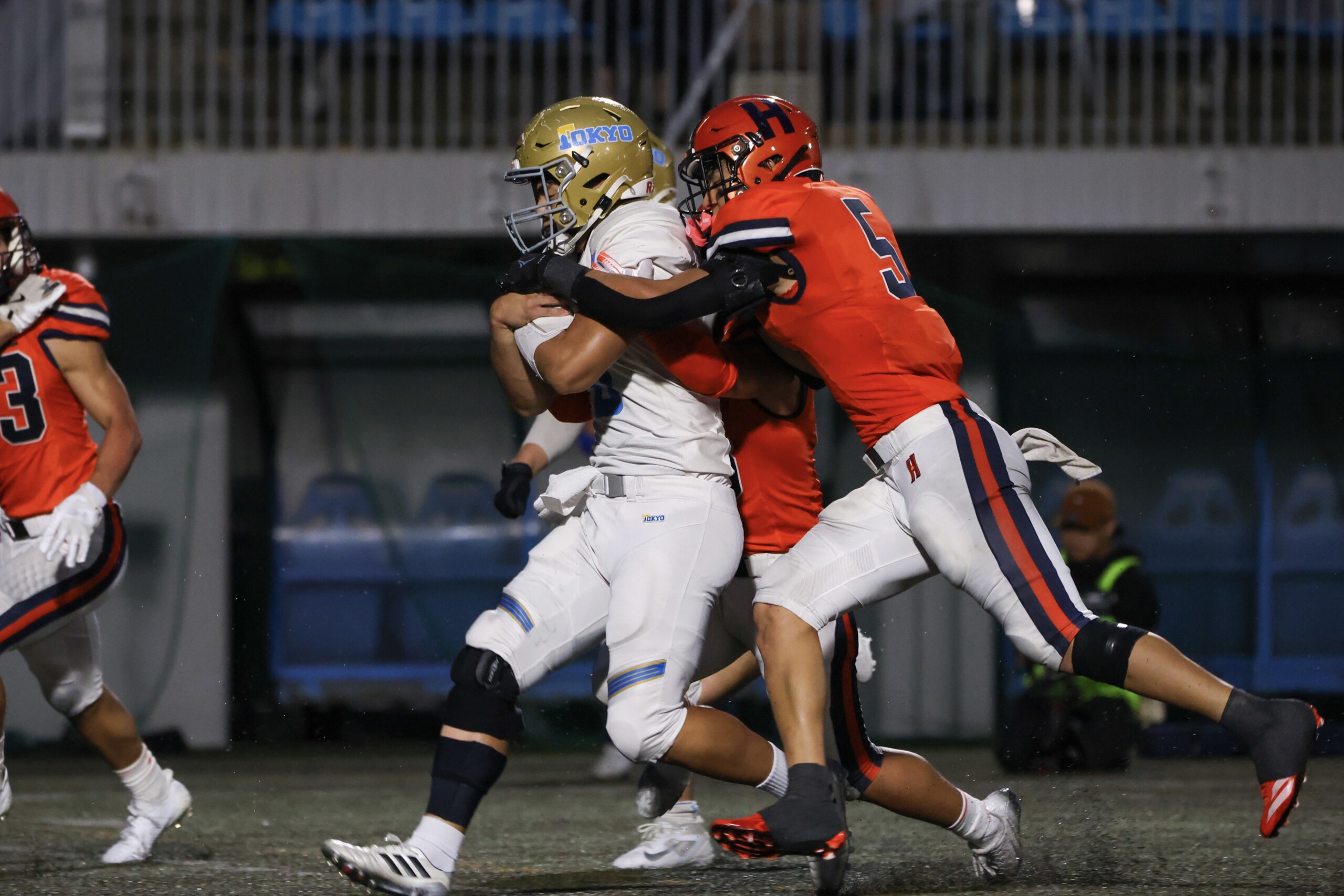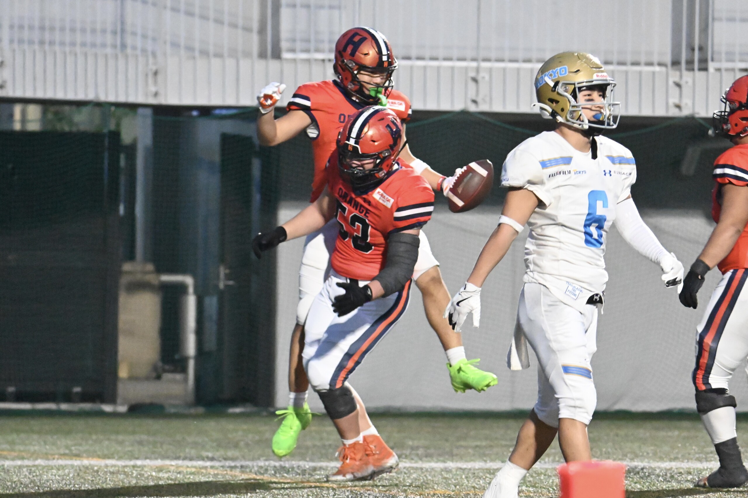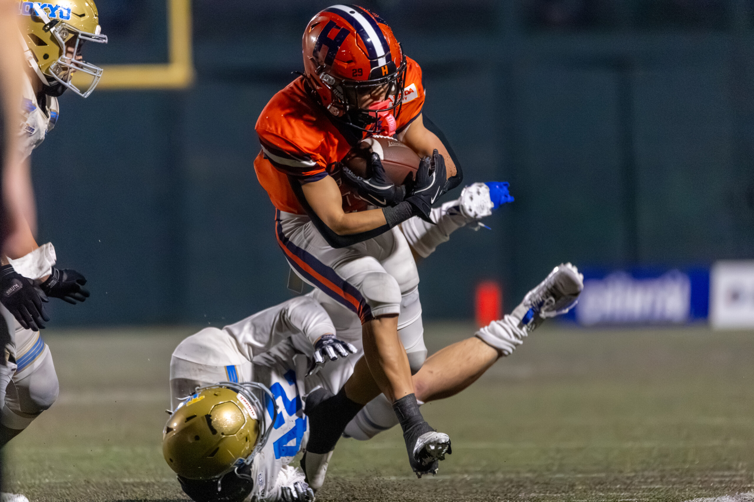 再開後のキックオフはアウトオブバウンズとなり東大の攻撃は敵陣35ヤードから。RACにより自陣32ヤードまで前進されるも、その後はDL赤穂谷怜旺(法1=法政二)によるパスカットもあり、3&outに抑えて、攻撃権は法大へ。自陣18ヤードからの攻撃はRB今手太陽(キャ1=駒場学園)のランプレーにより自陣35ヤードまで前進するも、続く1st&10でQB菊地慶(法3=法政二)の阿部へのパスをインターセプトされてしまい、ターンオーバーとなる。フィールド中央50ヤードからの東大の攻撃はパスプレーを止められず、ゴール前3ヤードまで前進されてしまう。最後は2nd&goalで日本代表にも選ばれた東大キャプテン太田へのTDパスを通され49ー28と点差を詰められる。それでも再開後の東大のオンサイドキックを高津佐が見事にキャッチ。その後の攻撃はRB宮本樹音(文2=佼成学園)、竹村真柊(法3=箕面自由学園)のランプレーにより攻撃を組み立てる。TDこそ奪えなかったものの、時計の針をしっかりと進めてそのまま試合終了。49ー28で2勝1敗同士の対戦を制し、3勝目を挙げた。