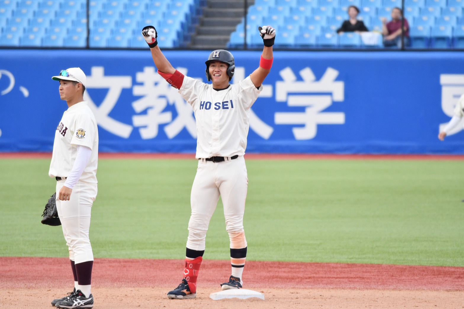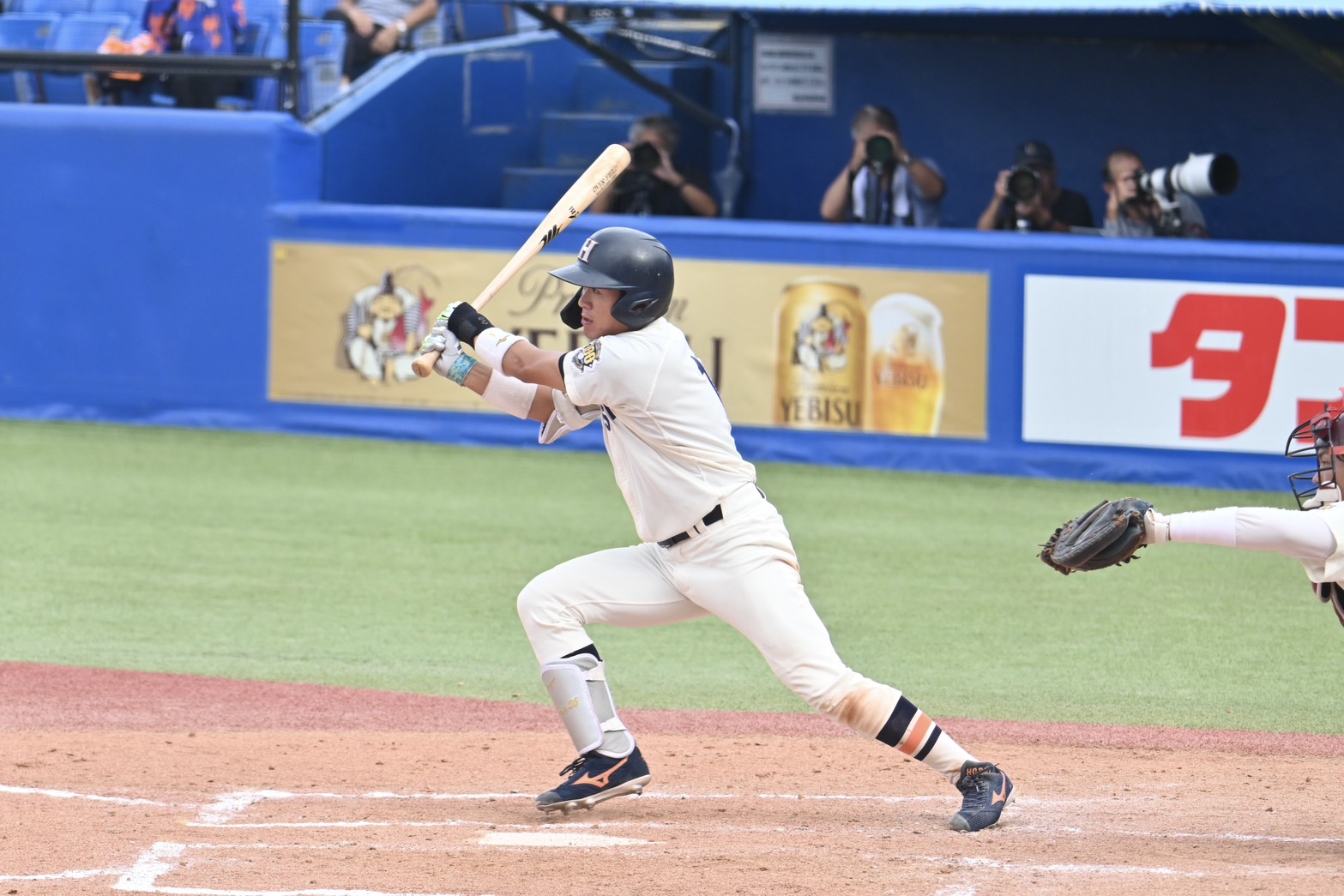 その裏、1番・境亮陽(営1=大阪桐蔭)が敵失で出塁すると、その境を犠打で二塁に進める、3番・藤森康淳(営3=天理)の右前適時打で幸先よく先制。その藤森康は盗塁死で2死となるも、松下歩叶(営4=桐蔭学園)は内野安打で出塁。続く5番・片山悠真(文3=八王子学園)が右越え適時三塁打を放ち、この回2点を先制する。