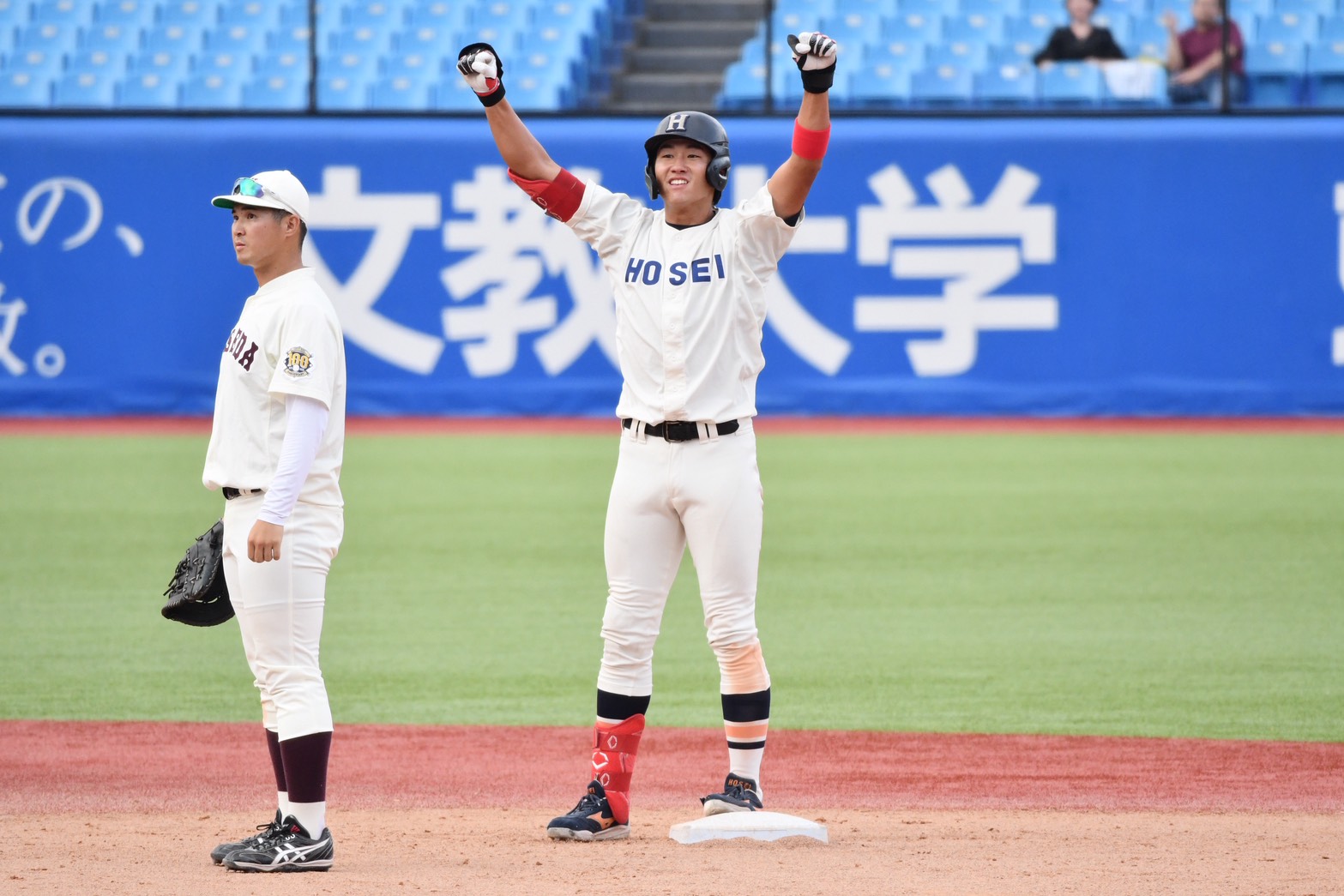 クリーンナップを形成する3年生外野手コンビが、神宮をオレンジに染めあげる。「血の法明戦」の名にふさわしい打撃戦を制し、優勝戦線へ名乗りを上げたい。