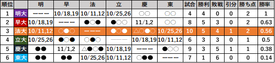一方の法大だが、勝つためには「打って打って打ちまくる」しかないと考える。実際、明大の毛利を除いた投手陣の中で、第二先発の座を手に入れた選手は未だおらず、ブルペンデーを行っているのが現状だ。そのため現在の法大打線の状態ならば第2試合を打ち勝つ実力は十分に存在すると言えよう。なので、繰り返しにはなるが勝ち点獲得の鍵を握るのは「1試合目の毛利をいかに早く打ち崩せるか」にかかっている。同じくリーグを代表する投手・伊藤樹から6点を挙げた強力打線は果たして通用するのか。目が離せない。