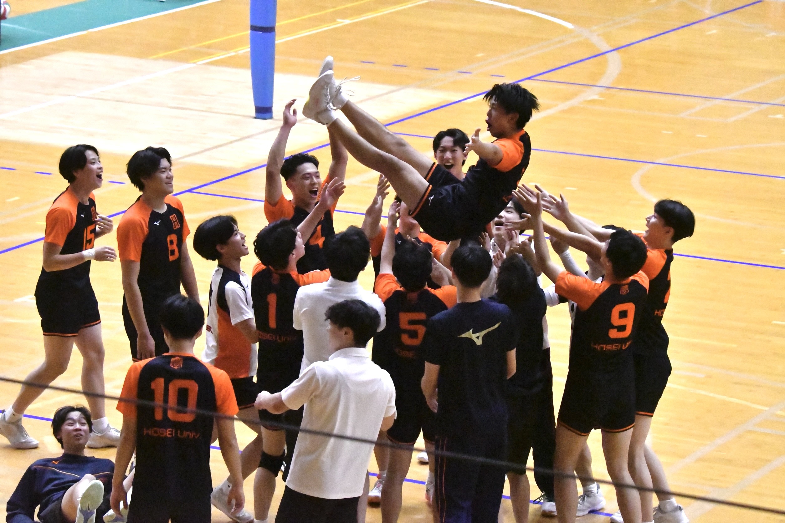 第4セットの勢いのまま臨んだ最終セット。またも小竹の得点からスタート。途中川波のバックアタックが何度も決まる。法大はどんどん得点を重ねていき、15-5と相手に隙を与えない力を見せ、セットカウント3-2で勝利した。