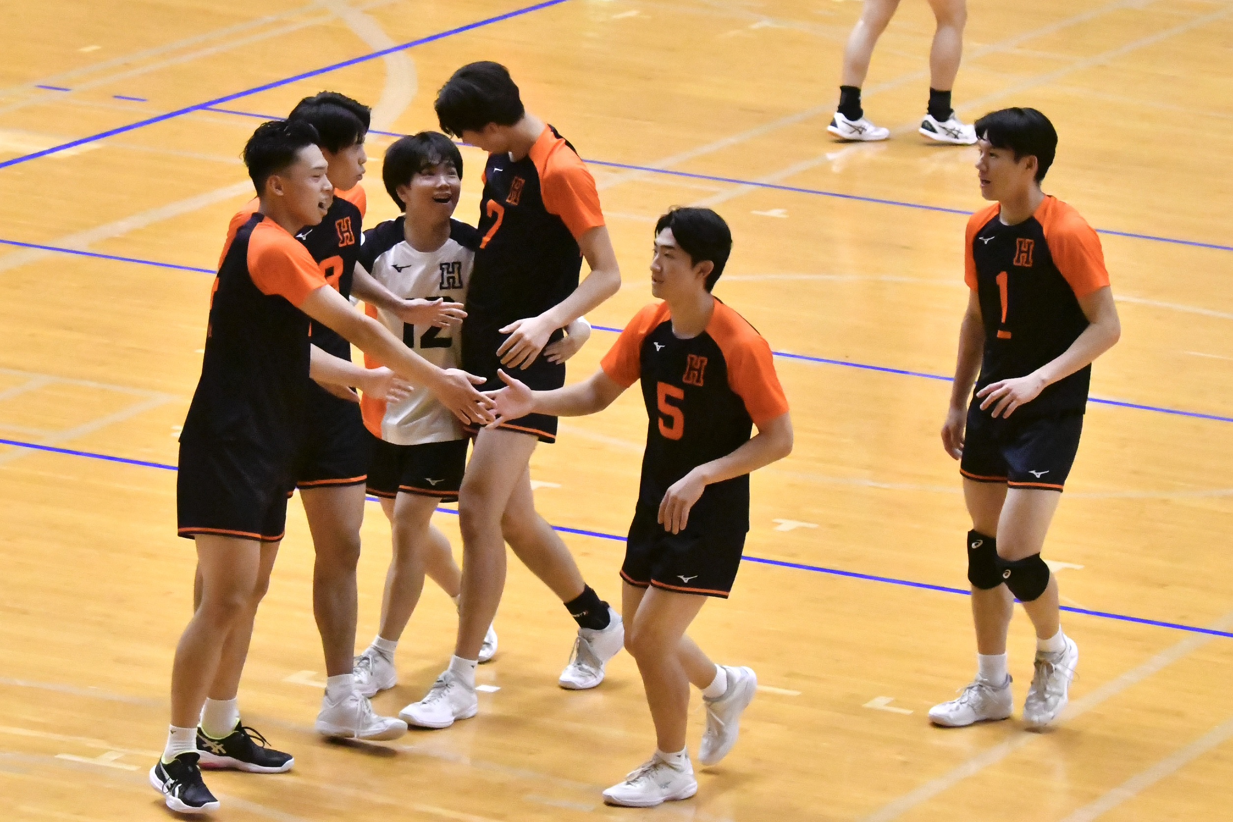 取り返したい第2セット序盤、L関大斗(営3)の3本目のレシーブが相手選手の間に落ち、コートで関を持ち上げる盛り上がりを見せる。これを機に渡邊秀真(法4)のノータッチエース、MB小田周平(営3)の速攻などで11-5とリードを奪う。しかし相手も粘りを見せ、2点差まで追い上げられるも川波がサービスエースを決め、19-15から勢いに乗ると、最後はMB村岡蓮斗(法3)の攻撃で25-20で第2セットを取る。