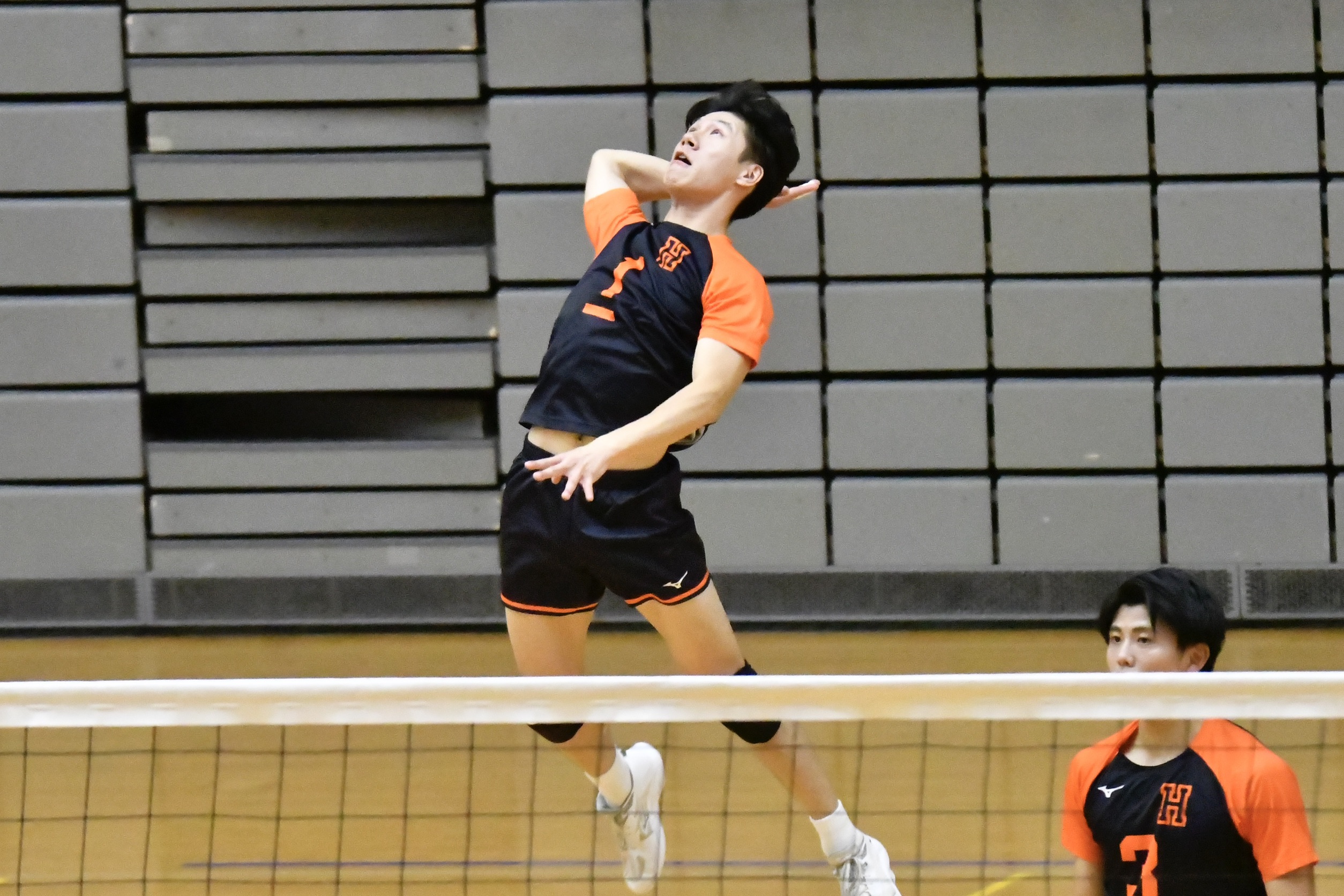 第1セット、序盤から一進一退の攻撃が続く。11-11からWS川波颯(文4)の攻撃でブレイクするも、点差をつけることができない。20点代になっても21-21と競り合うも、法大のミスが続き22-25で第1セットを落とす。