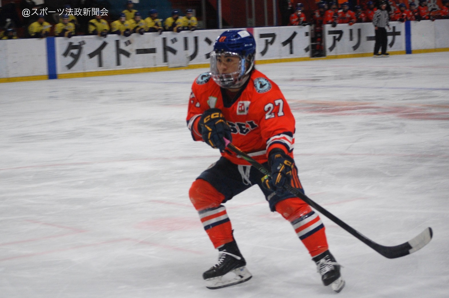 立ち上がり一進一退の攻防が続くも明大に先制点を許すと連続失点で主導権を握られる展開に。2Pの下坪丈馬のゴールでチームに勢いをもたらすと北山堅士の3試合連続得点で追い上げを図った。しかし、明大の壁は厚く、追加点を入れられ悔しい敗戦となった。ファーストリーグ最終戦は黒星となった。