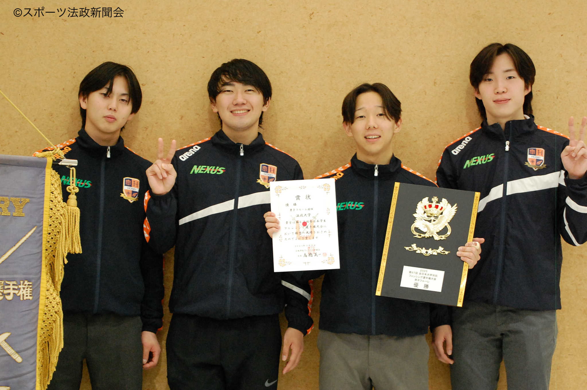 表彰後の男子フルーレメンバー 左から、鎌田晃成(営2=鹿児島南)、福田亮介(営3=大垣南)、関本祐大(営2=開新)、河村一摩(営4=愛工大名電)