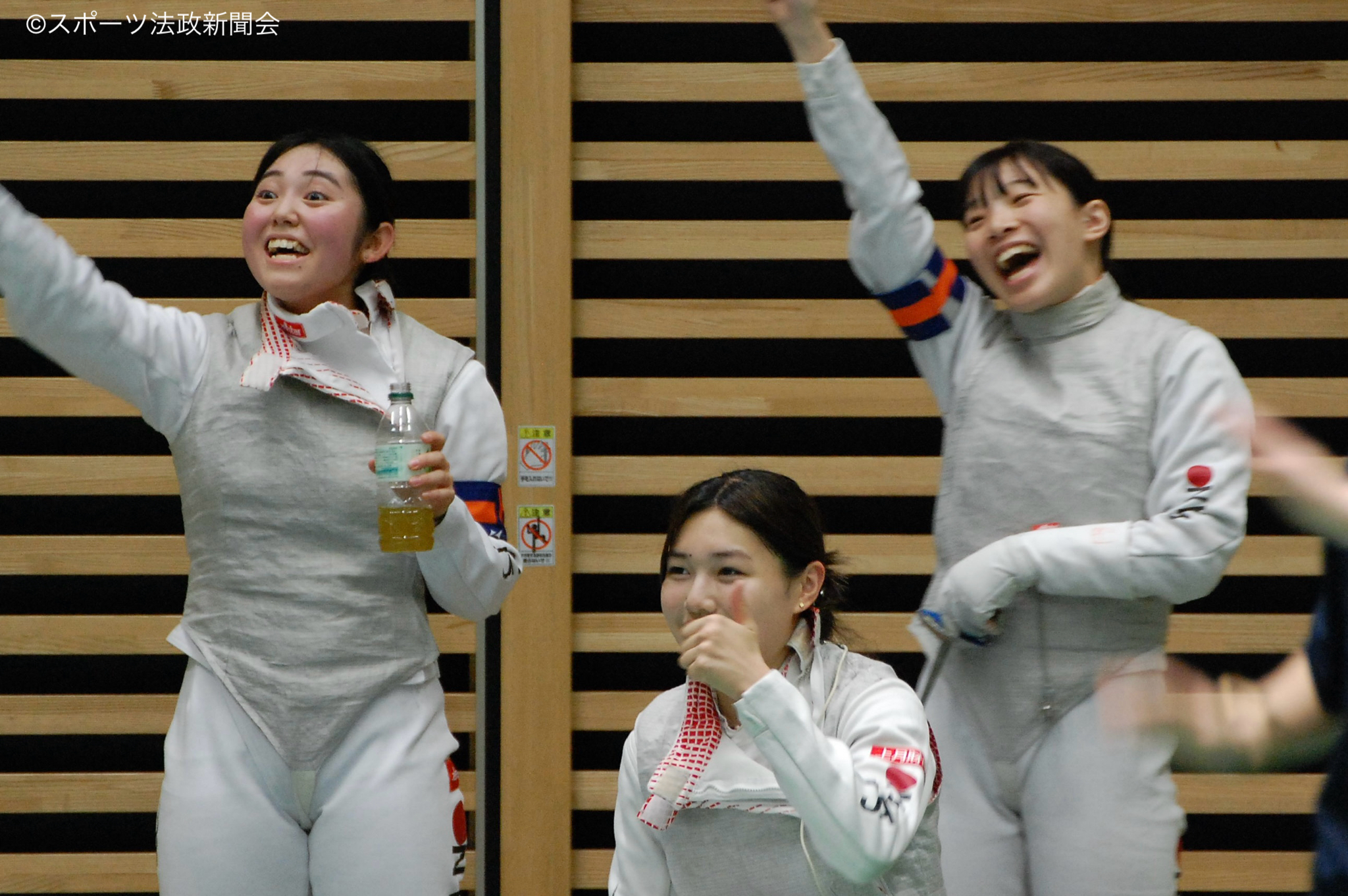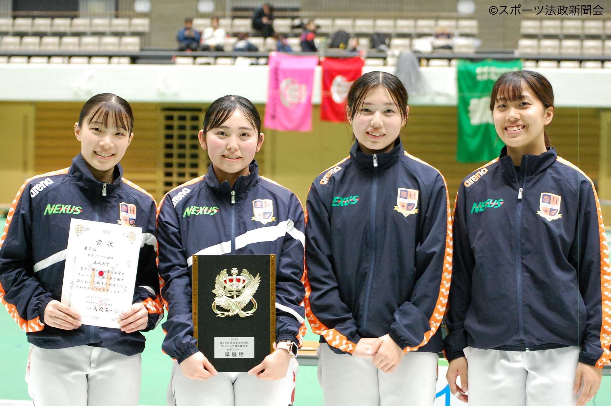 準優勝を女子フルーレメンバー 左から、千葉穂波(法3=仙台城南)、山田ひなた(国3=愛工大名電)、久保田未織乃(法1=東亜学園)、清水美伶(文1=大垣南)