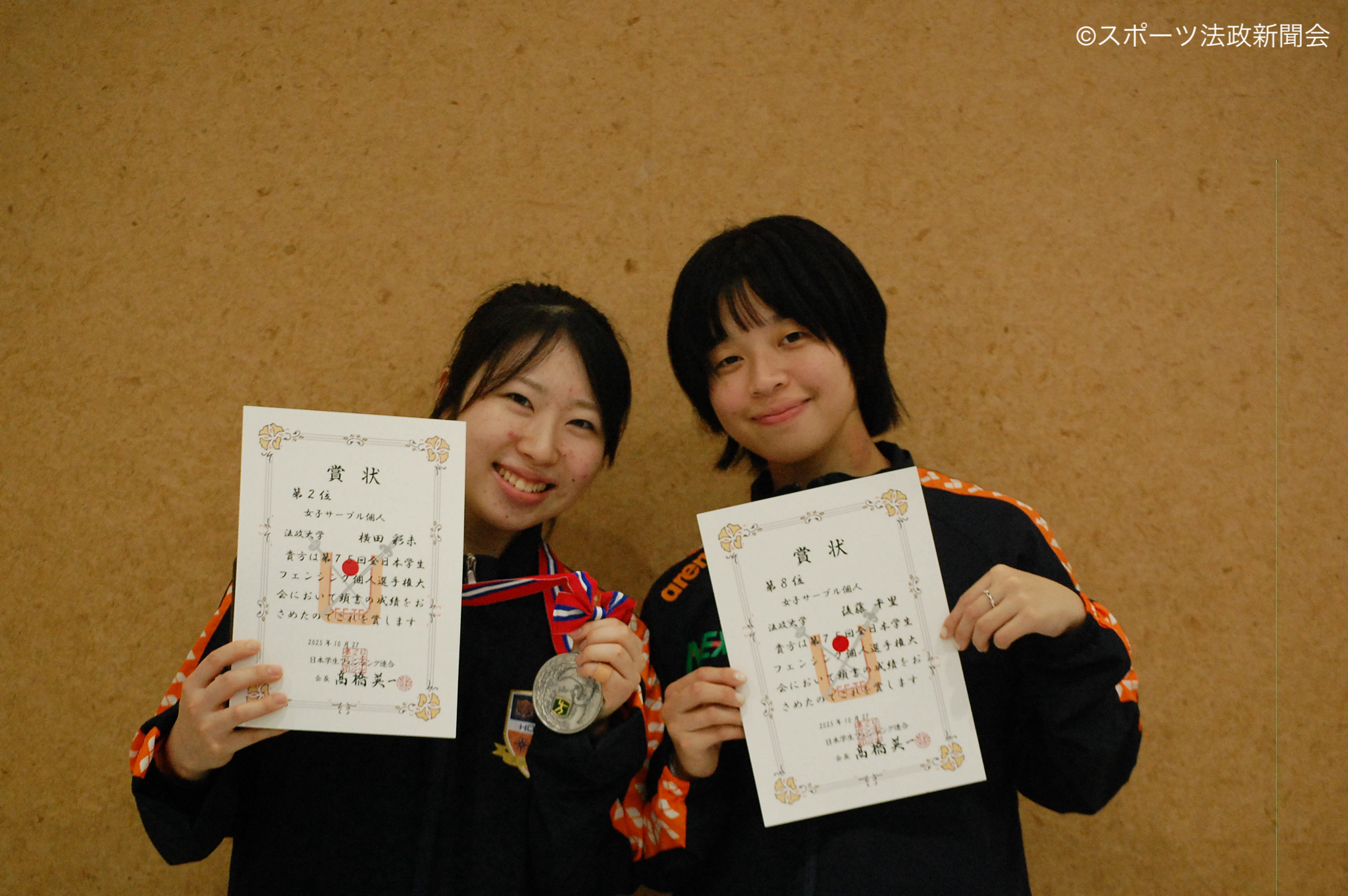 女子サーブルで準優勝を果たした横田彩未(文3=法政二高)と8位入賞の後藤千里(法2=高松北)