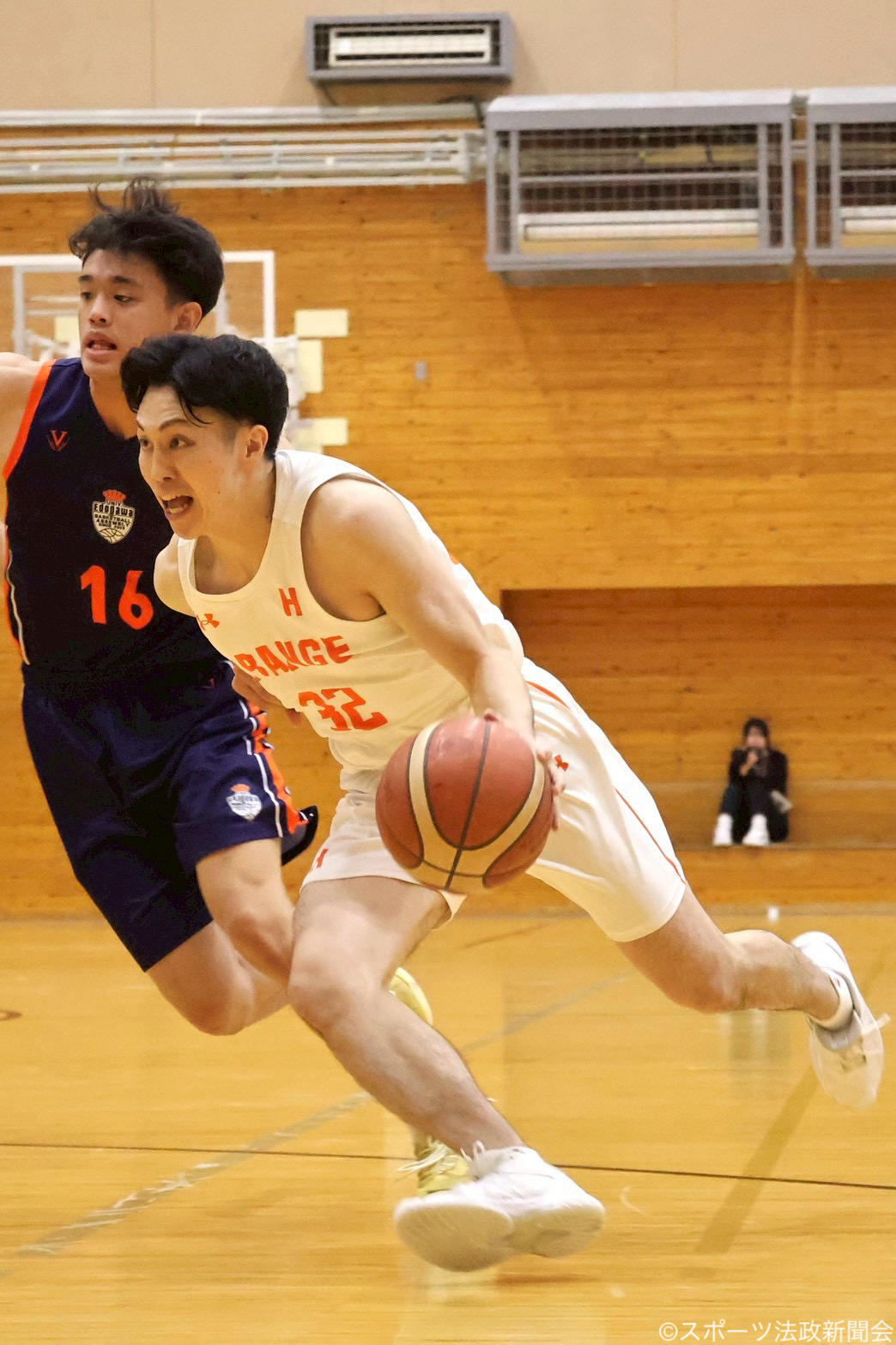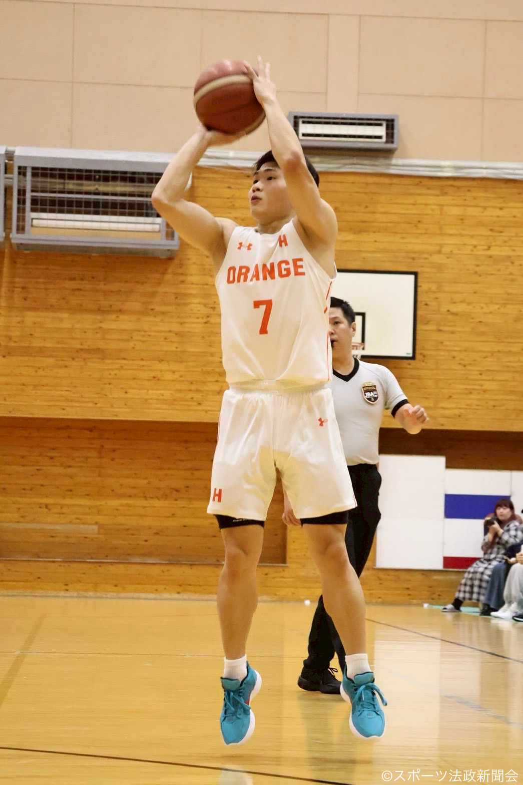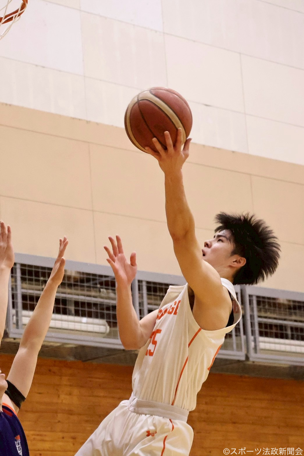 第4Qは#0 杉信のフローター、#18 八重沢の得点などでジリジリと点差を詰めていく。しかし、#91 オディギェ プレシャス 恵(法1=湘南工科大附)が立て続けにファウルを取られ、江戸川大にフリースローで得点を与えてしまう。中盤でも江戸川大の連続得点によって点差を広げられたが、劣勢の場面でも#25 鍋田がオフェンスを牽引。フローター、レイアップと立て続けに得点し、チームに流れを呼び戻す。終盤には#75 柳田がレイアップで得点し意地を見せたが、江戸川大の速攻を止め切れず、点差を詰めきれないまま64-80で試合終了。法大が自力で1部入れ替え戦に進出するには、最終節で圧勝且つ国士舘大が敗北しなければ厳しい状況に追い込まれた。