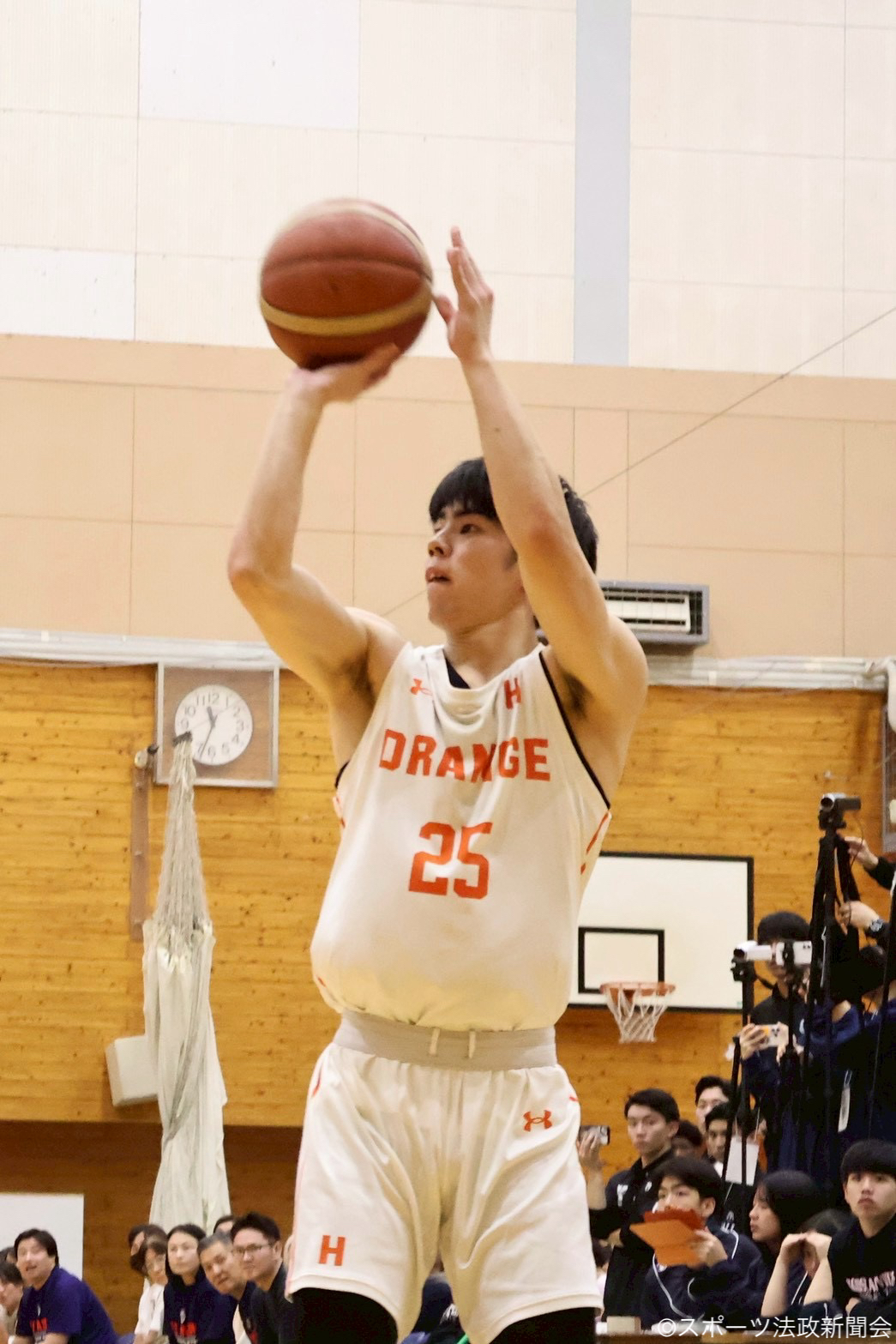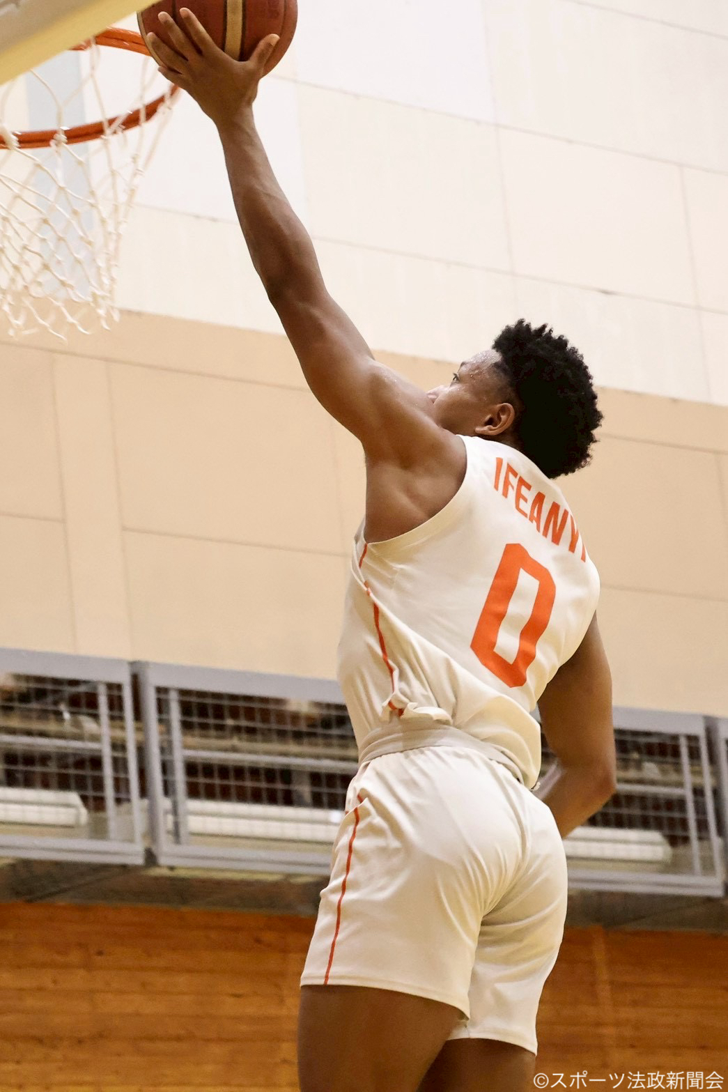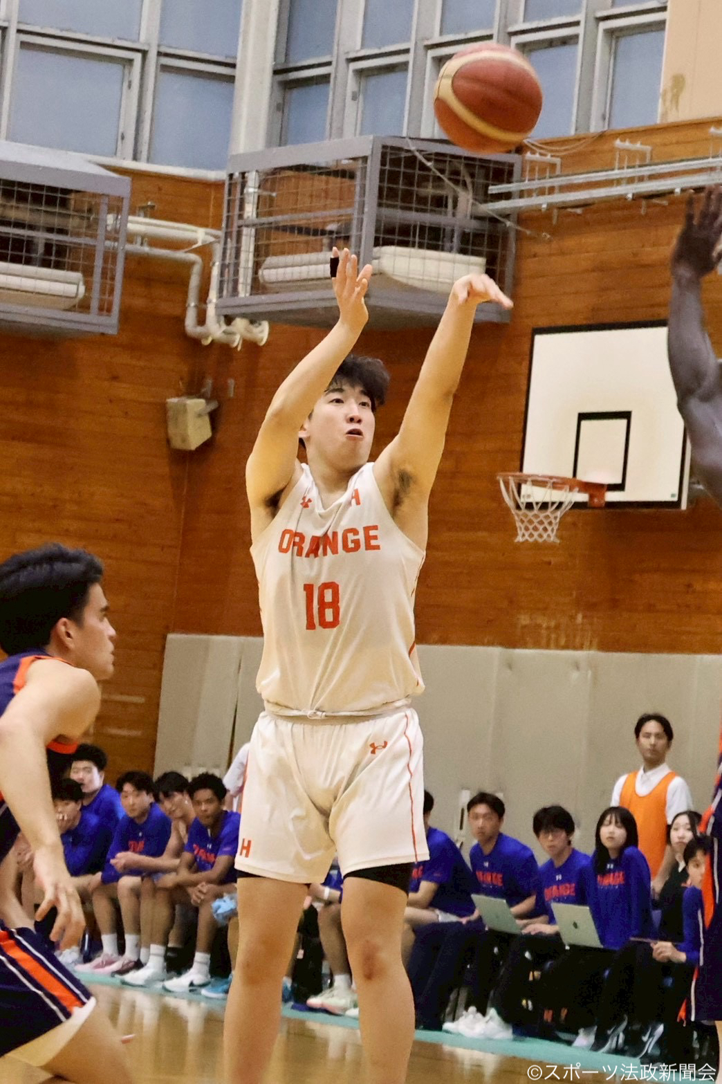 第4Qは#0 杉信のフローター、#18 八重沢の得点などでジリジリと点差を詰めていく。しかし、#91 オディギェ プレシャス 恵(法1=湘南工科大附)が立て続けにファウルを取られ、江戸川大にフリースローで得点を与えてしまう。中盤でも江戸川大の連続得点によって点差を広げられたが、劣勢の場面でも#25 鍋田がオフェンスを牽引。フローター、レイアップと立て続けに得点し、チームに流れを呼び戻す。終盤には#75 柳田がレイアップで得点し意地を見せたが、江戸川大の速攻を止め切れず、点差を詰めきれないまま64-80で試合終了。法大が自力で1部入れ替え戦に進出するには、最終節で圧勝且つ国士舘大が敗北しなければ厳しい状況に追い込まれた。