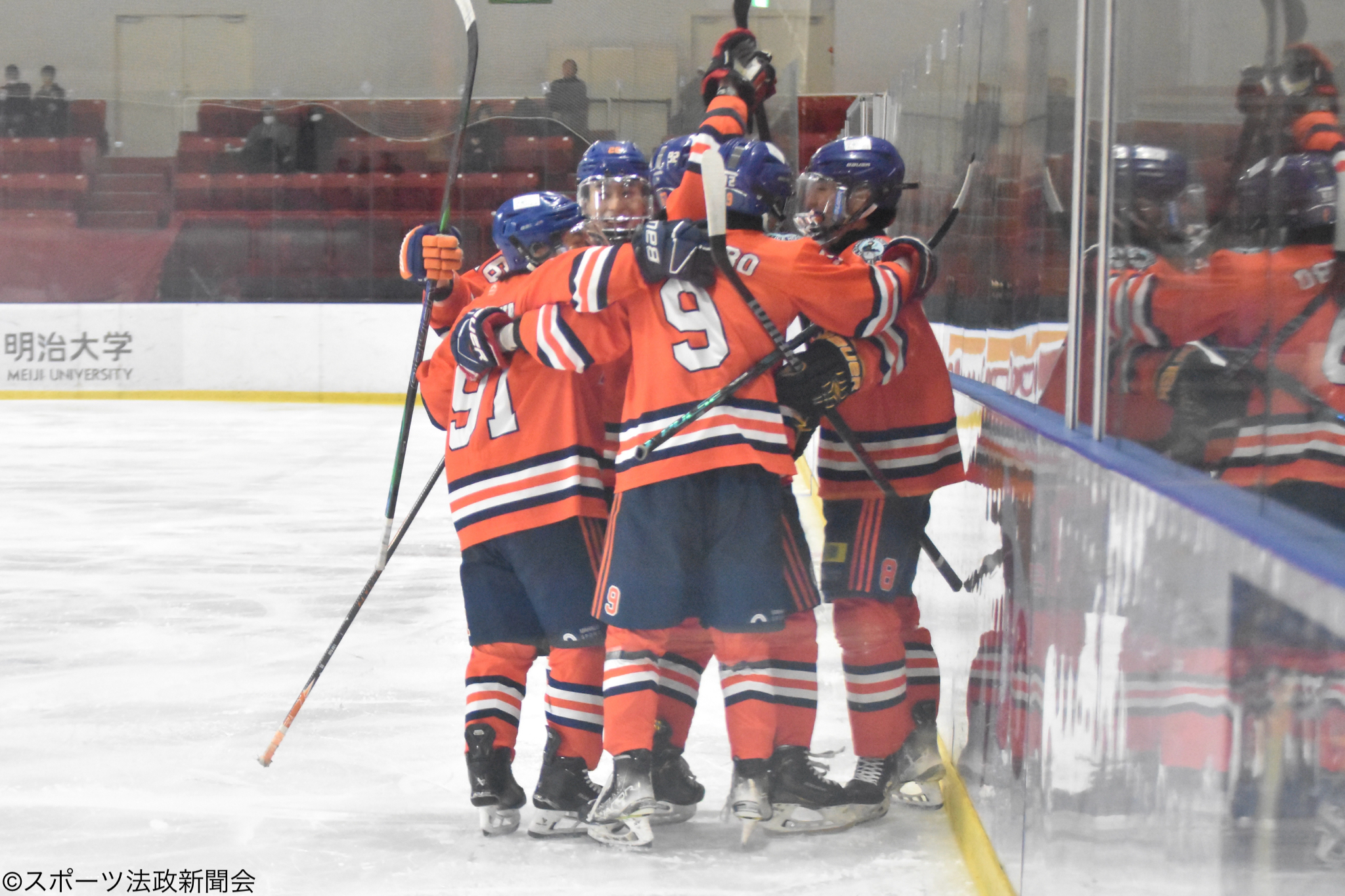 1P、序盤から明大と激しい攻防を繰り広げる。その中で下坪丈馬(法1=清水)がリバウンドを押し込み先制に成功するが、明大のシュートがリプレー判定によりゴールに覆されて追いつかれる。その後パワープレー時に明大にカウンターされ、勝ち越しを許してしまう。終盤には追加点を許し、明大に2点リードを許す展開となり1Pが終了。法大は2Pに逆転を狙う。