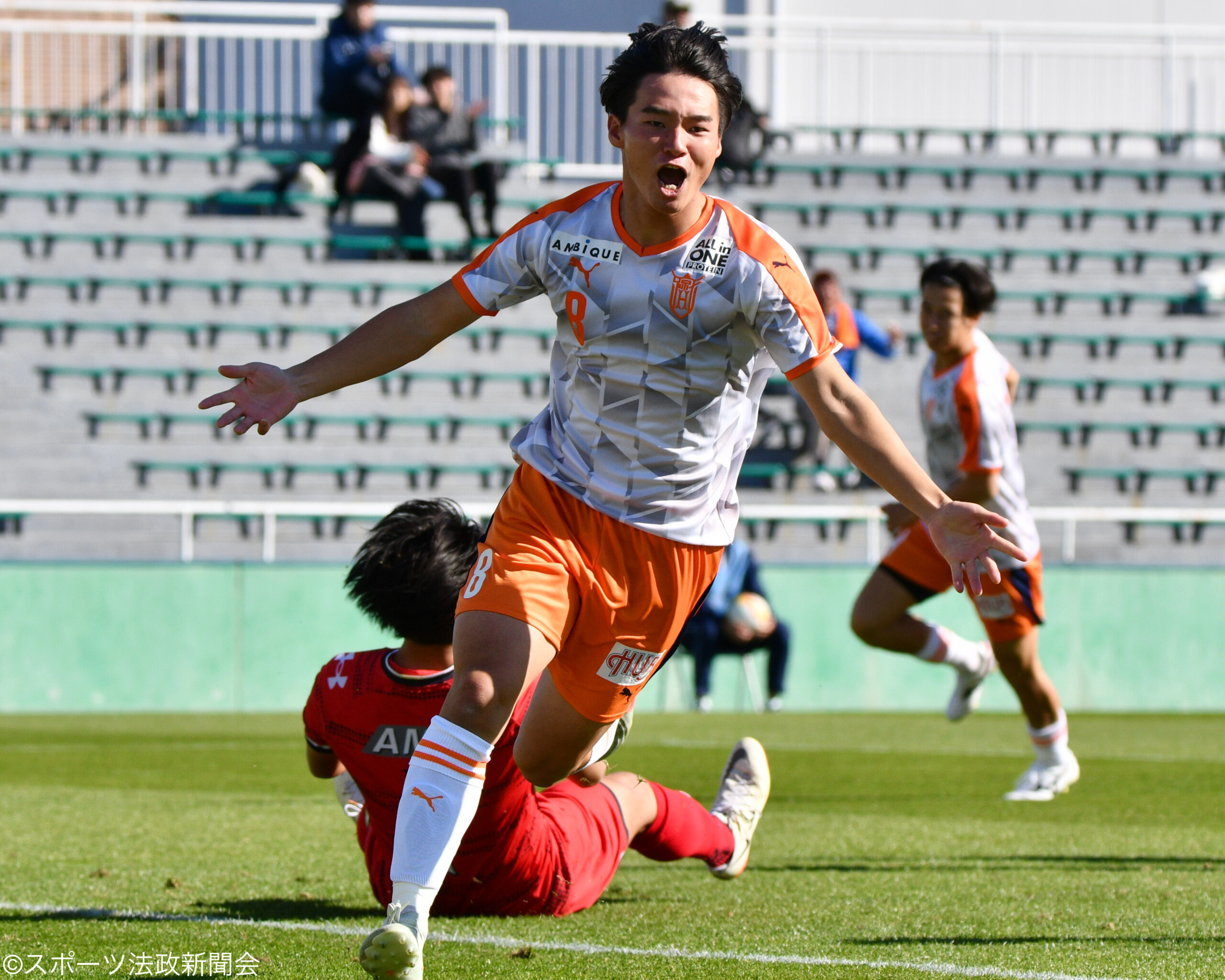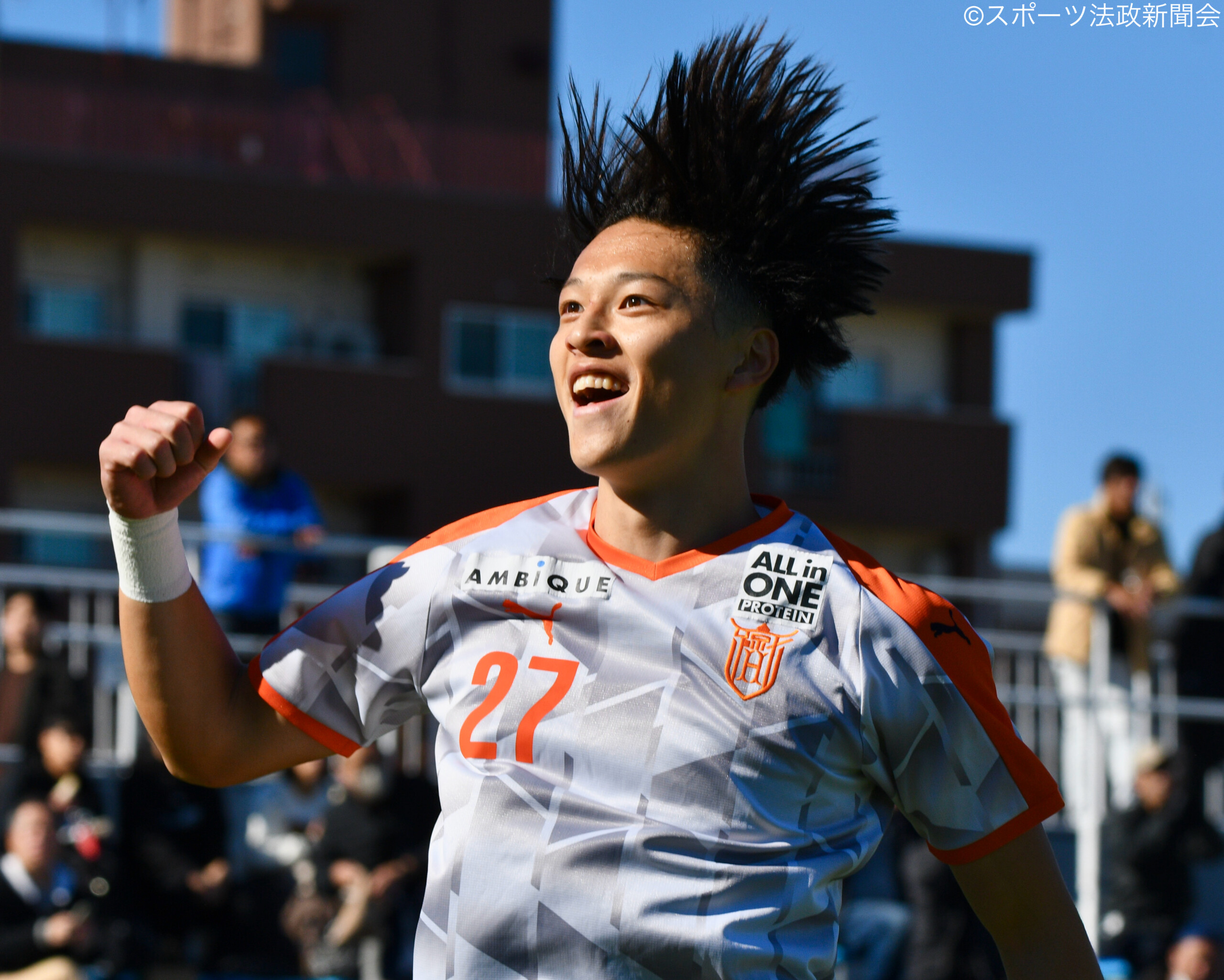 後半も法大は、前線から激しいプレスをかけていく。すると49分、相手陣内でのボール奪取を起点に、ゴール前でボールを受けた松村晃助(経3= 横浜F・マリノス ユース ・横浜F・マリノス内定)が、DFを1人かわしてシュートを放つ。これはGKにセーブされるも、そのこぼれ球にいち早く反応した浅野が、きっちり決め切り、待望の追加点を奪う。