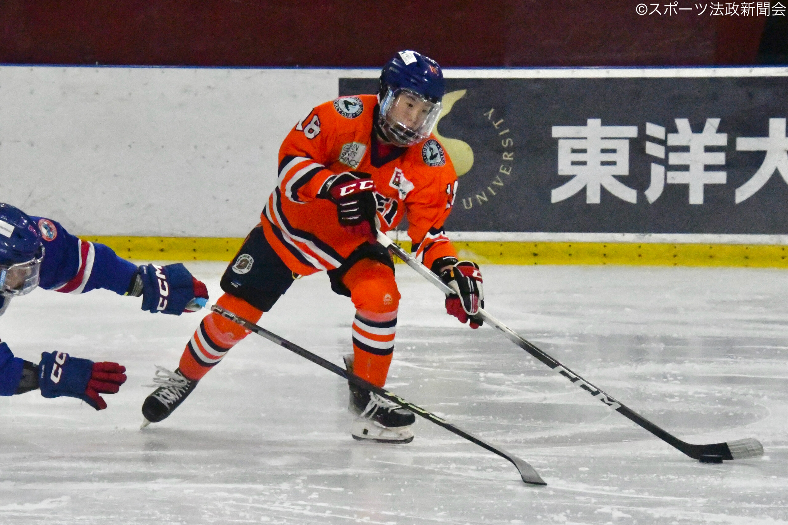 このままでは終われない法大、2P開始早々本地将大(人1=清水)との連携から金子輝叶(営3=白樺学園)がゴール。エースのゴールで1点を返す。さらに38分、パワープレー終了直後の流れから、最後は下坪丈馬(法1=清水)が押し込み3試合連続ゴール。点差を3点に縮め2Pを終えた。