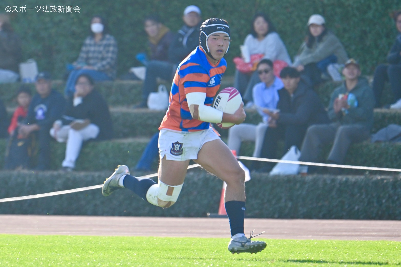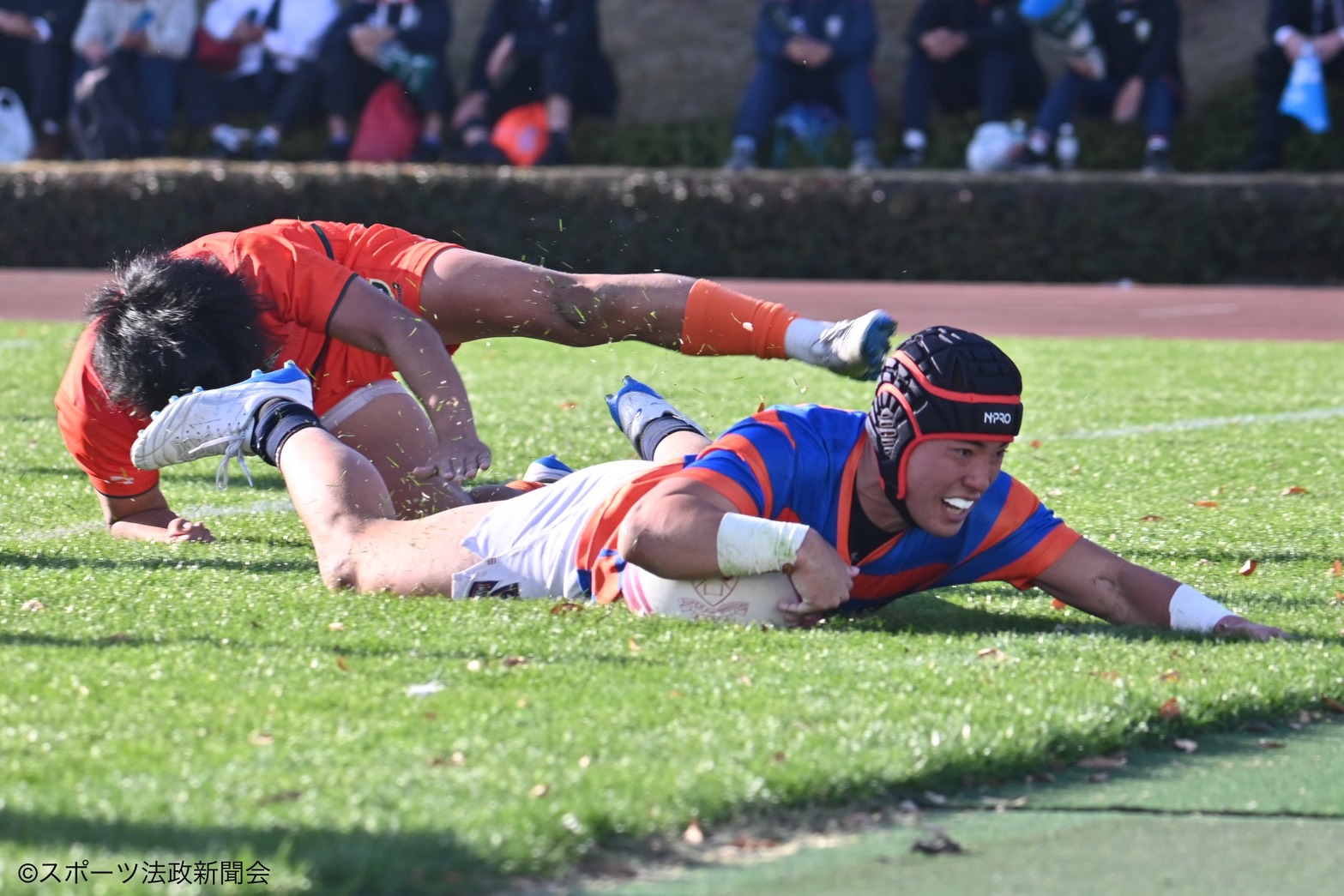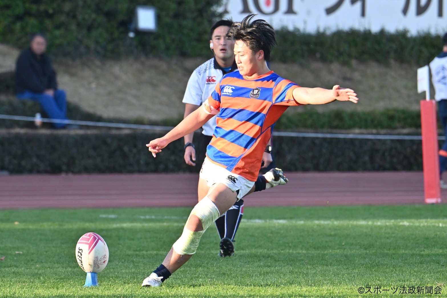 それでも法大は19分、自陣のフリーキックからBKへ展開し、WTB福本耀(2)が左サイドを大きく突破。転がしたボールの跳ね返りをFB北川が拾い上げ、そのままインゴールへ。ゴールも決まり10-7と再び主導権を握った。