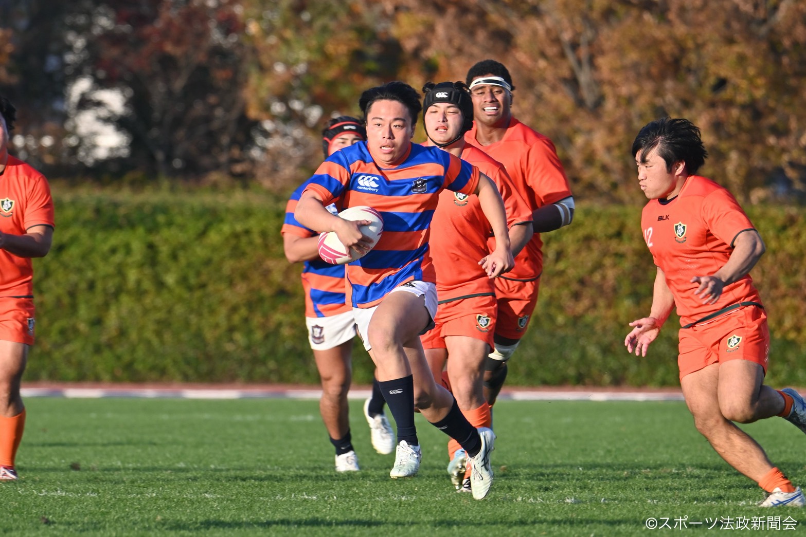 22分には、立正大の反則から敵陣22mライン上でスクラムのチャンスを得ると、2フェーズ目でLO細川幹太(4)が中央へ飛び込み17-7。リードを広げる。
