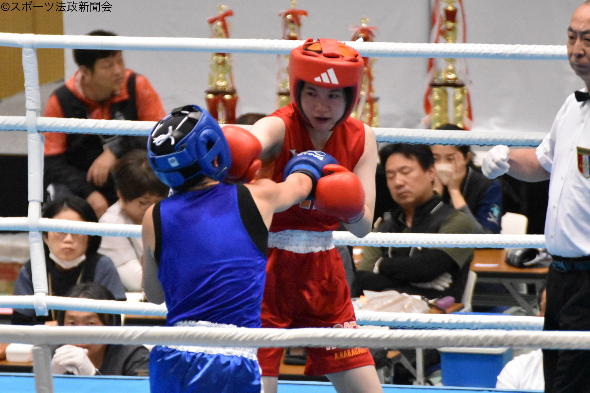 今大会、法大から唯一の女子選手としてフェザー級に出場した中川杏(文1=九州学院)は、初戦で昨年の全日本選手権2位である船山乃亜(日大)と対戦した。立ち上がりから中川は積極的に攻撃を仕掛けるも、相手リードのまま1Rを終了。2Rに入ると、相手の船山が距離を詰め、攻撃を仕掛けられる場面も見られたが、中川は精度の高い攻撃で流れを引き戻すことに成功し、ラウンドを互角に戻した。勝負の3Rも一進一退の攻防が続き、そのまま試合終了。2-3で判定が割れ、わずか1ポイント差で敗戦となった。