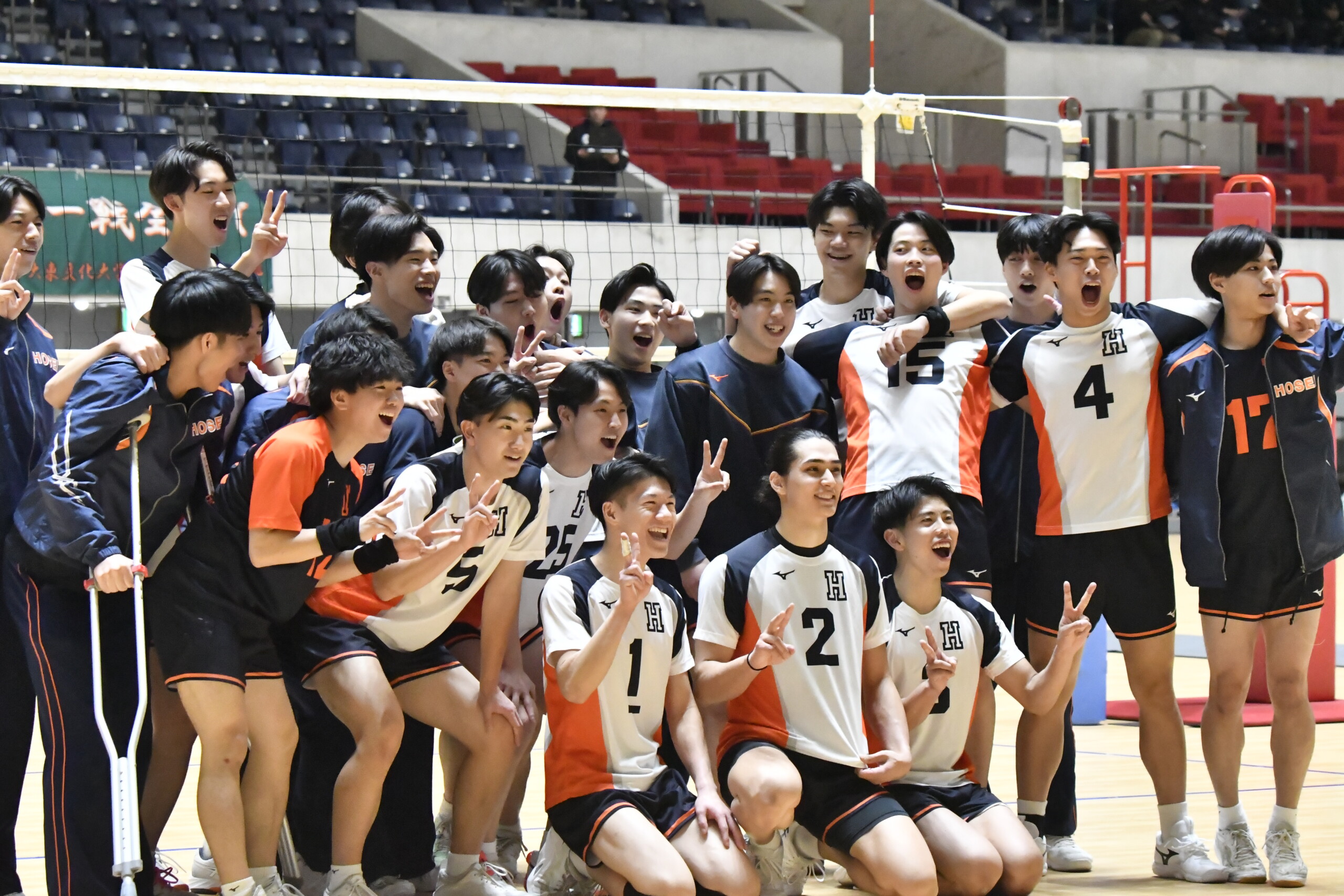 全日本インカレ2戦目の相手は秋季関西1部上位リーグ4位の京都産業大学。第1セットは得点が拮抗したものの20点を超えたところで法大の得点力を見せつけ、25-22でセットを先取。勢いそのままに第2セットも相手に流れを渡さず、25-15でセットを獲得。第3セットは落としたものの、第4セットでは多彩な攻撃が光りセットカウント3-1で見事勝利を収めた。