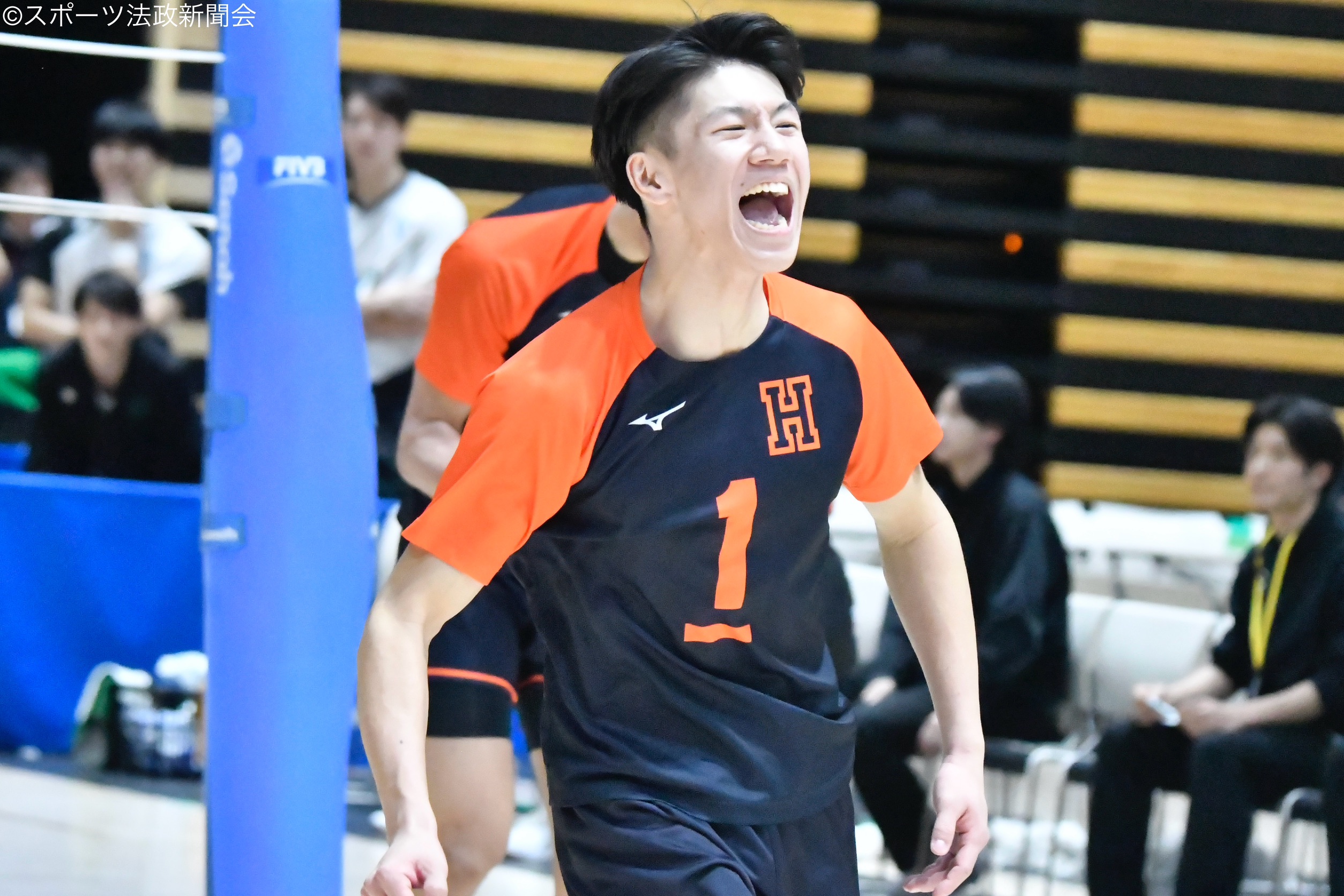 注目の1戦はMB小田周平(営3)のプロックから始まった。その後もWS高橋慶帆(営4)の強烈なスパイクで法大に流れを呼び寄せる。WS小竹飛斗(法4)の早い攻撃が決まり11-7と点差を広げる。しかし相手に3連続得点を許してしまい同点とされるもMB村岡蓮斗(法3)の連続ブロックでリードに成功する。中盤にはS五十嵐健人(営4)のブロックも飛び出し一気にチーム内を盛り上げる。最後は小竹のスパイクが決まり25-23で第1セットを先取する。