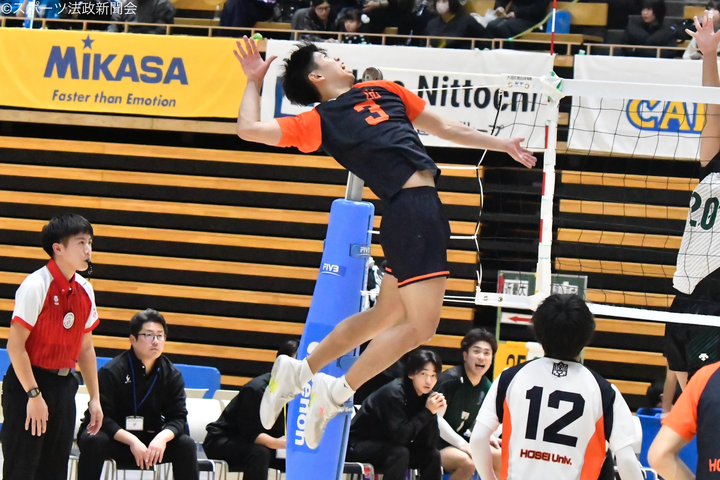 全カレ3日目となる今日の相手は、秋季リーグにセットカウント1-3で敗戦した専修大学。そして秋季リーグで対戦した際には不在であった甲斐優斗(専修大学)選手が出場していることもあり、日本代表同士の戦いに注目が集まった。第1セット、第2セットでは序盤から法大が勢いに乗り専大をプレーで圧倒していく展開となった。しかし第3セットは法大にミスが目立ち相手に連続得点を許すとその流れのままセットを落とす。切り替えたい法大であったが惜しくも届かずセットカウント2-3で敗戦した。