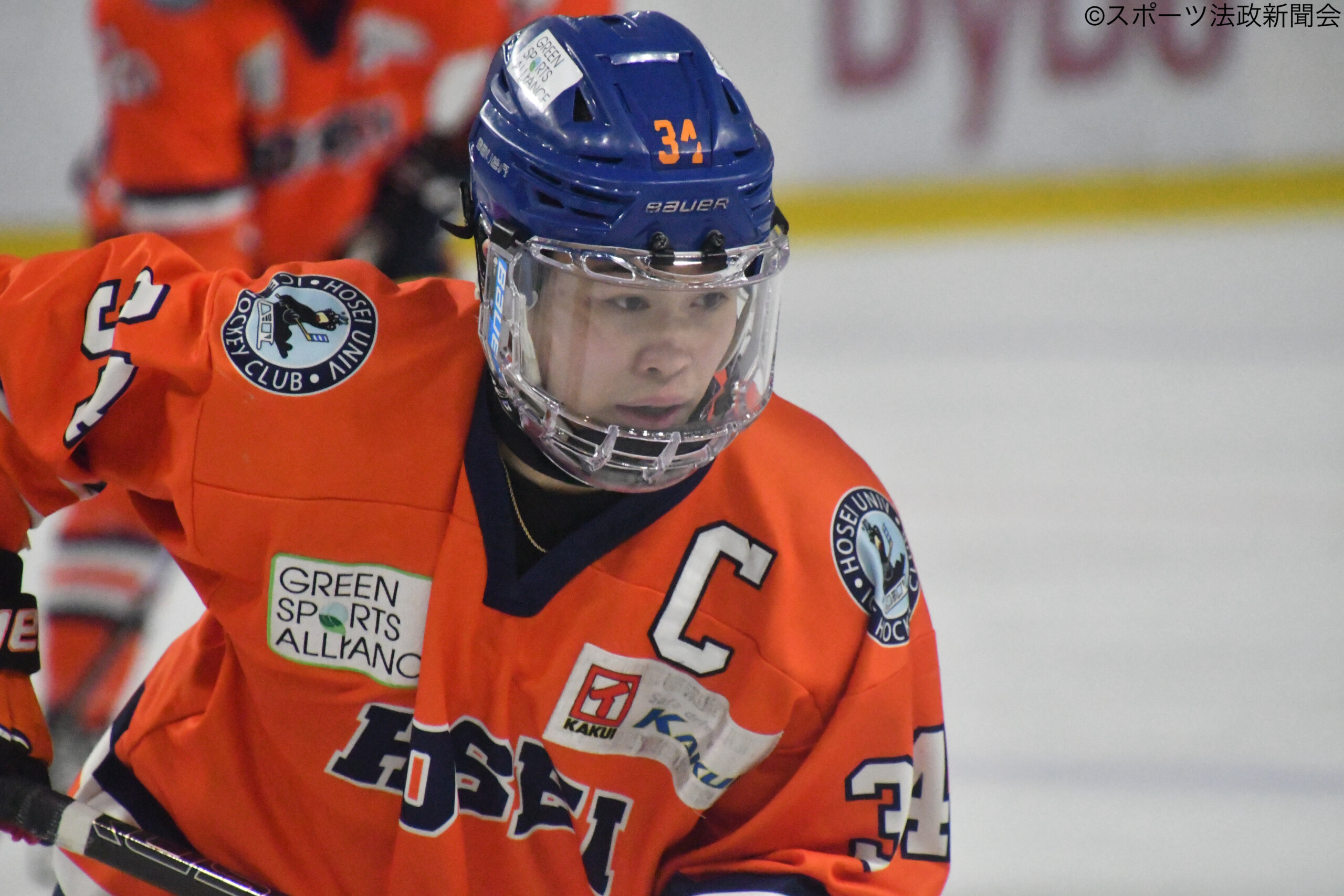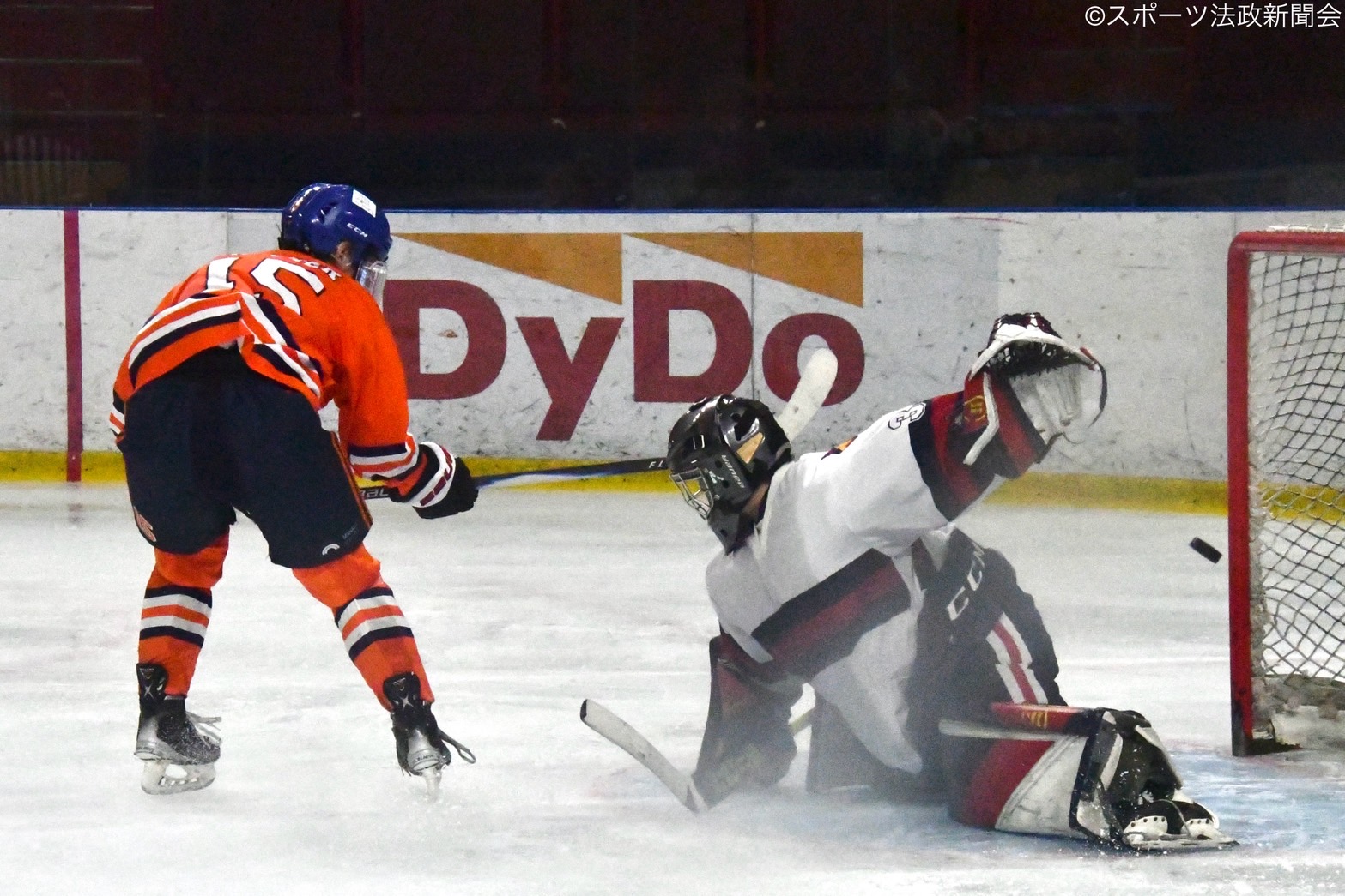 試合は開始早々同時に二人が退場になる苦しいスタートに。3対5のキルプレーとなると、一度は外れたルーズパックを押し込まれ先取点を決められてしまう。その後も攻め込まれキルプレーを取られるなど、不利な展開が続く。このままでは終われない法大、17分、下山晃世(文2=白樺学園)がついに流れを変える同点ゴール。終盤の得点でなんとか追いつき、試合を振り出しに戻し1Pを終えた。