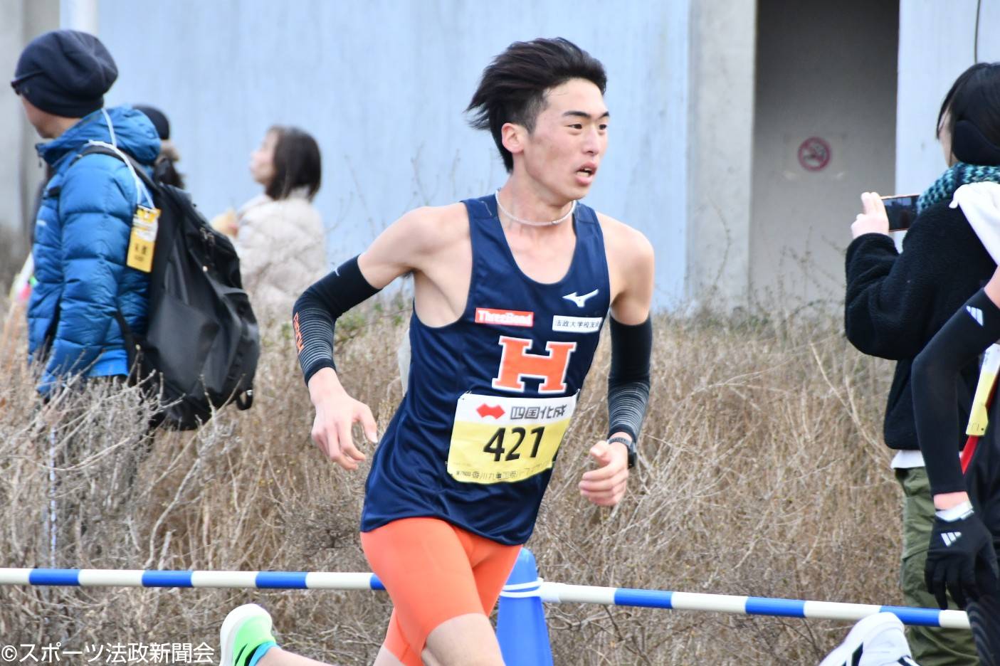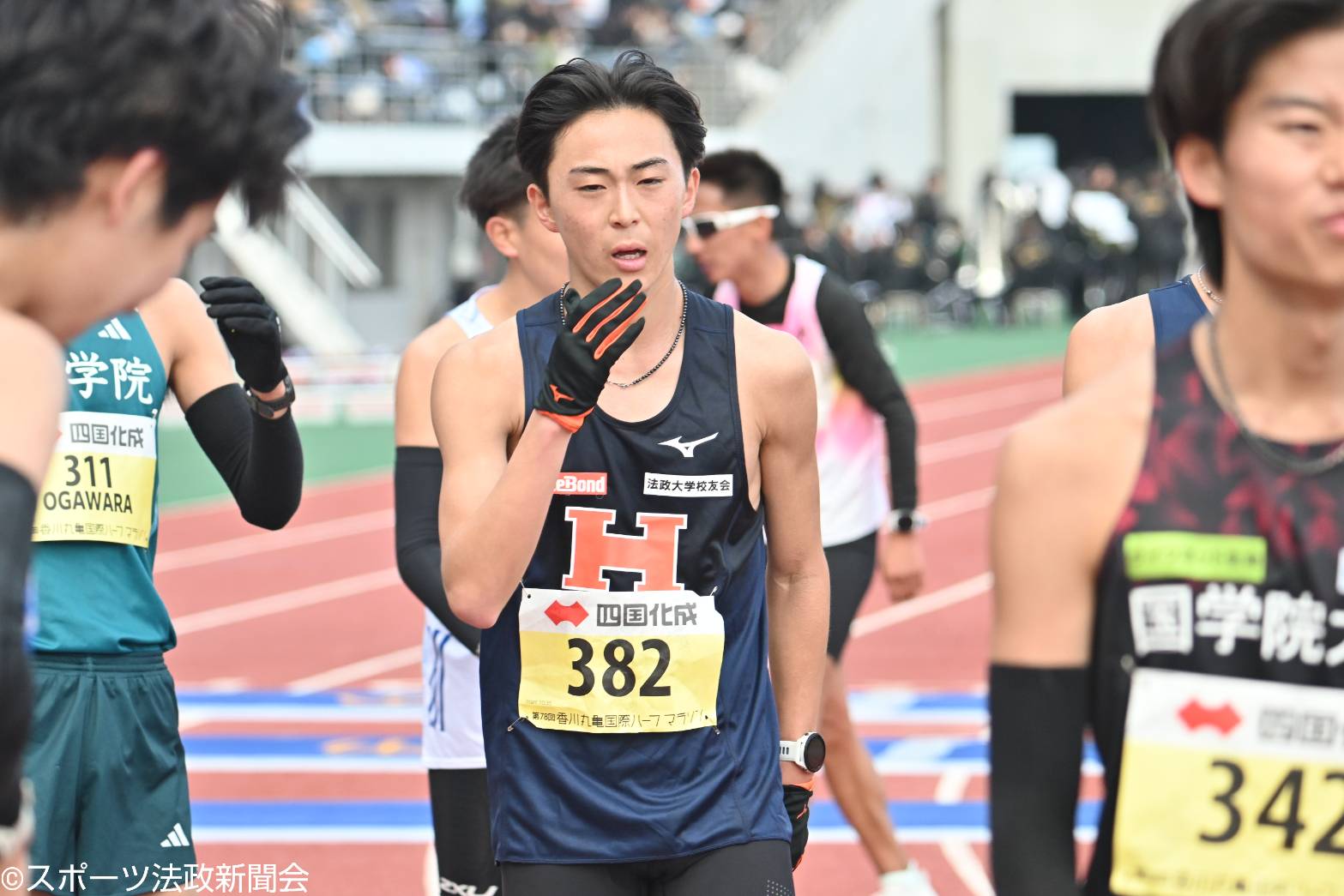 毎年日本屈指の超高速レースが展開される丸亀の地で、今年も学生ハーフマラソンが開催された。法大からは田井中悠成(経3=滋賀学園)、青手木陽太(経2=自由ヶ丘)が出場。さらに、丸亀ハーフの招待選手として大島史也(社4=専大松戸)も出場した。昨年は法大新が2人出た今大会で、今年も好記録がでるのか。