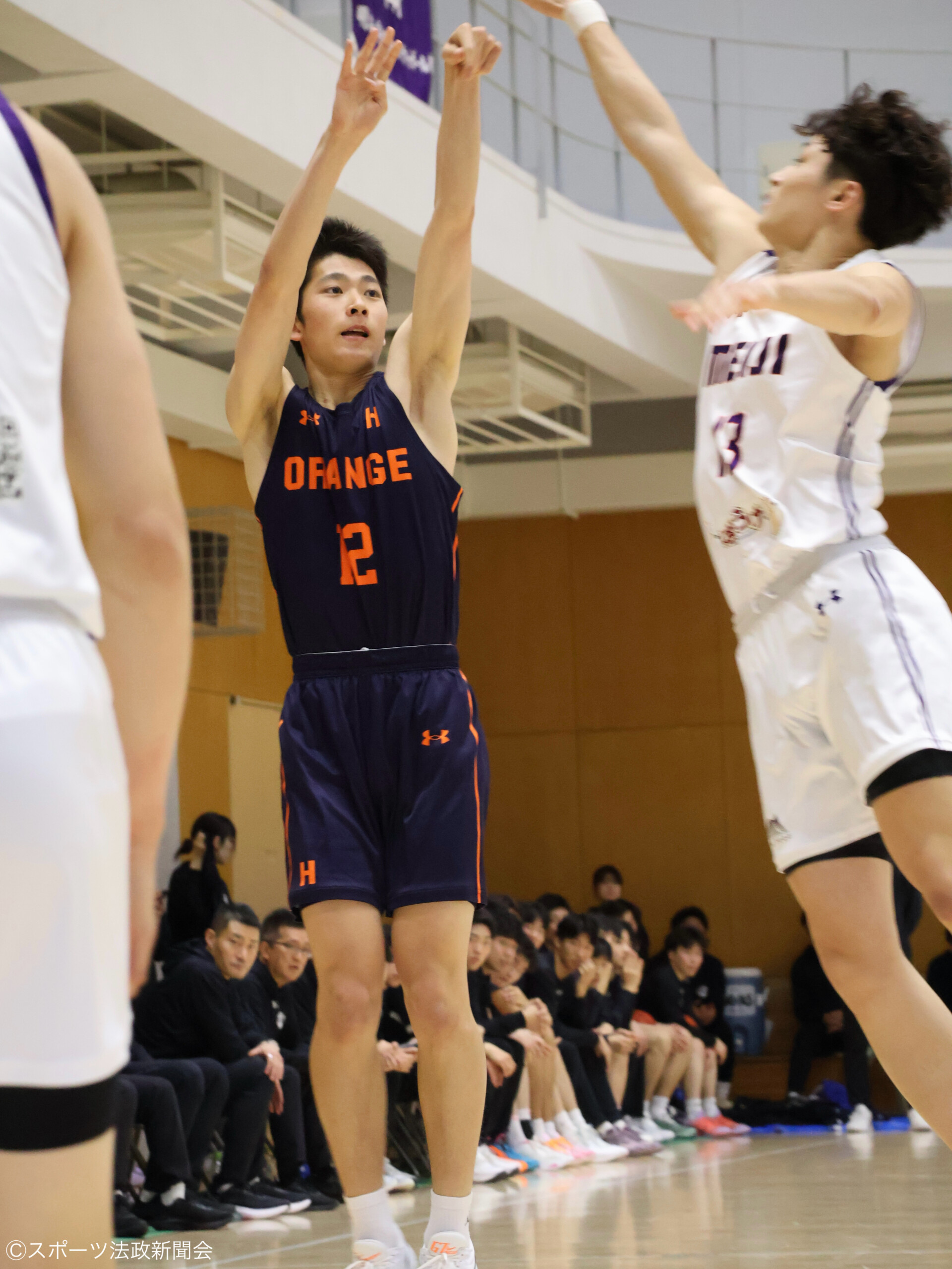 法大と相手の両者譲らぬオールコートマンツーマンの攻防はさらに激しさを増していく。第1Qに比べ、ゲームスピードが上がっていく。中でも野田の素早いボール運びが法大のオフェンスを牽引する。しかし、この速いゲーム展開に法大はズレが生じ、相手にターンオーバーを幾度と許してしまう。それでも、鍋田がゲームを落ち着かせ、圧巻のオフェンスセンスを披露する。鍋田と八重沢のスクリーンプレーで見せたコンビネーションで相手を翻弄。13点差は第1Qから変わらずも質の高いオフェンスを披露した。
