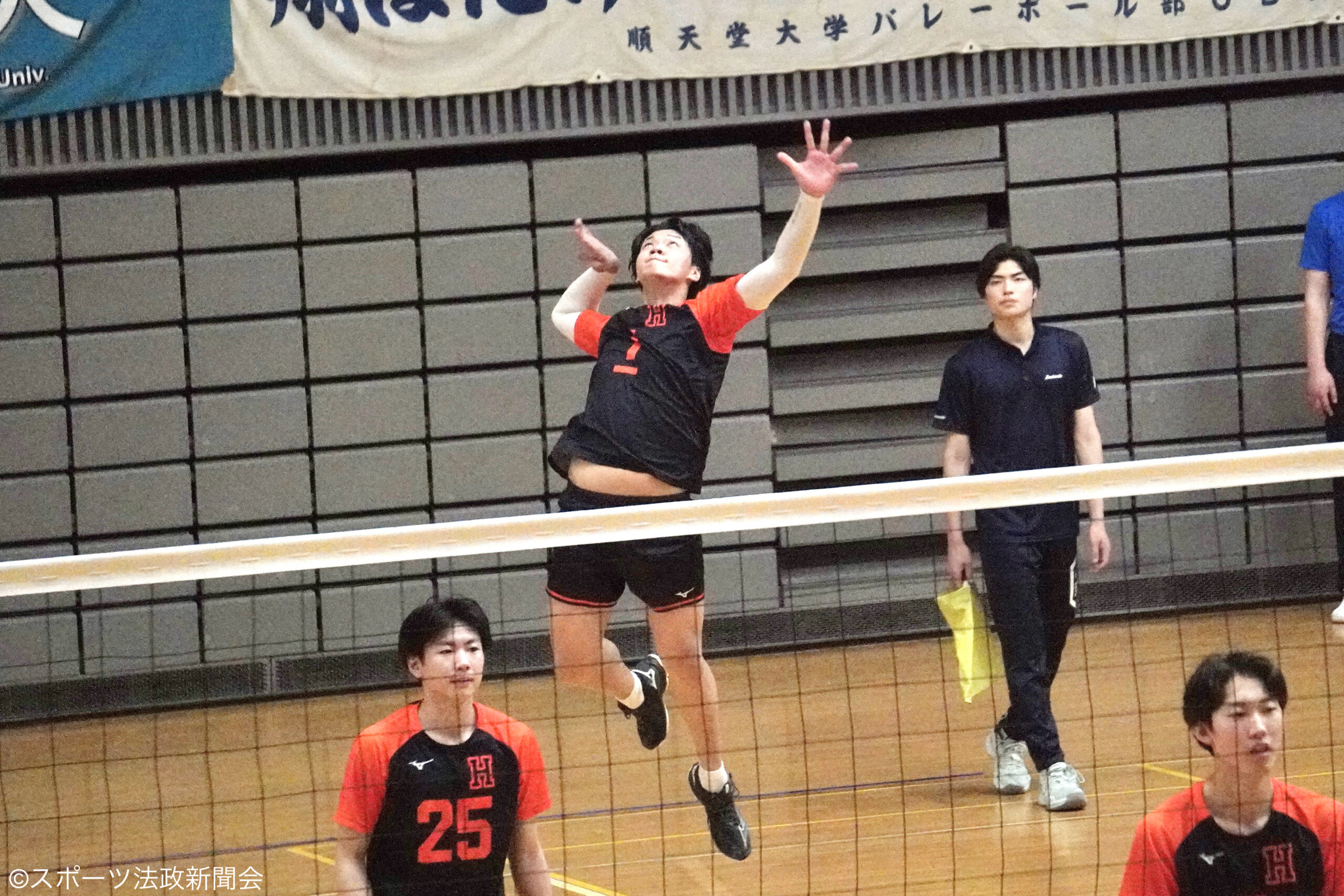 第1セット、一進一退の攻防が続く中相手に3連続得点を許し14-16と点差を広げられてしまう。流れを取り戻したい法大は新入生のOH津末将生太(法1)のスパイクが決まり1点差とする。終盤OPローガン建造(営1)の鋭い攻撃やS林慎之介(文2)のツーアタックで22-21と逆転に成功する。このままの流れでセットを取りたかった法大だったが簡単にセットを取らせてくれないのが筑波大だ。高さのあるブロックで攻撃を阻まれ最後まで粘りを見せたが第1セットを31-33で落とす。