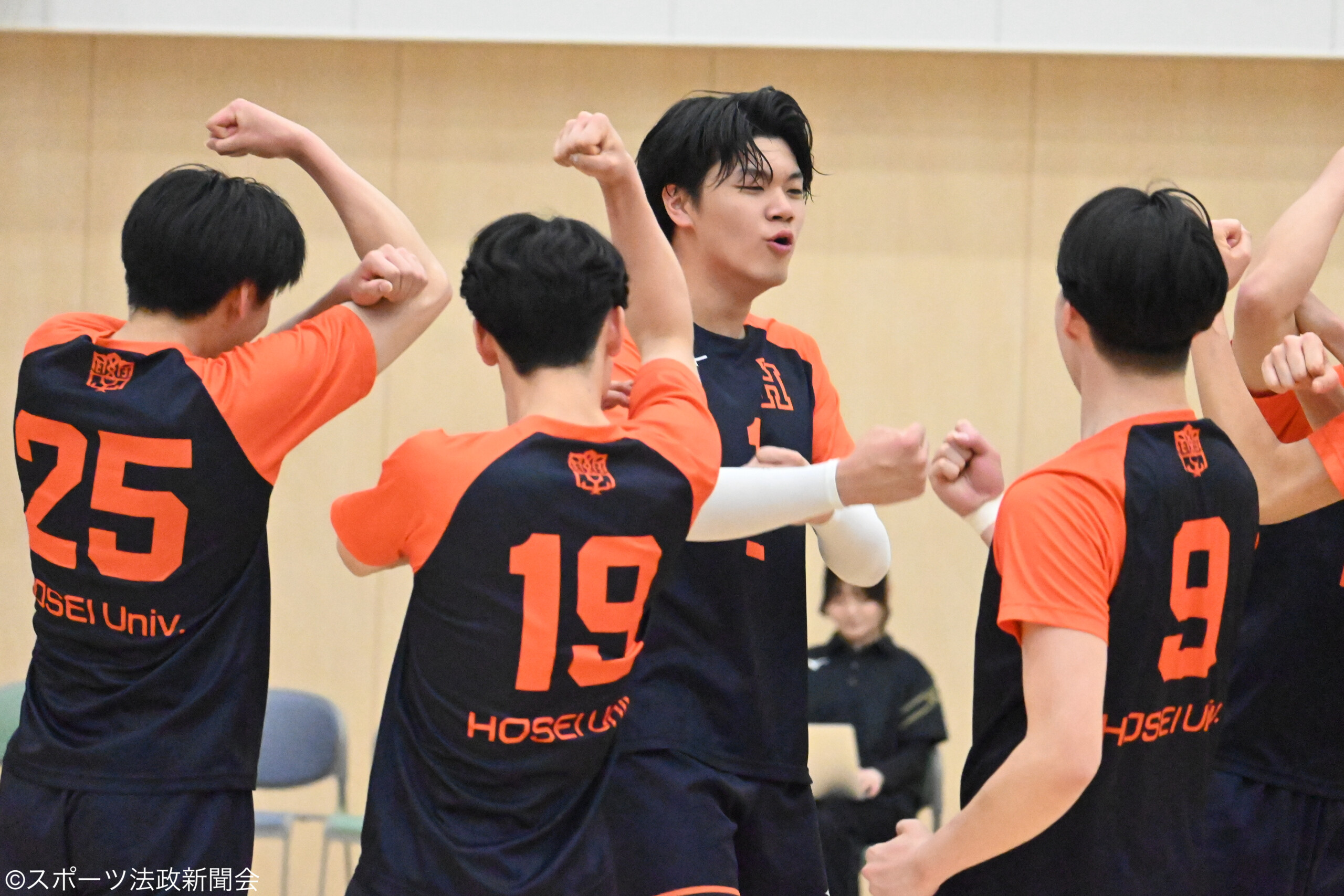 第1セット、序盤から相手に6連続得点を許す展開となり法大にとって苦しいスタートとなる。S林真之介(文2)のツーアタックや相手の意表を突くコースでサービスエースを決める。しかし序盤の失点が響き17-25と第1セットを落とす。