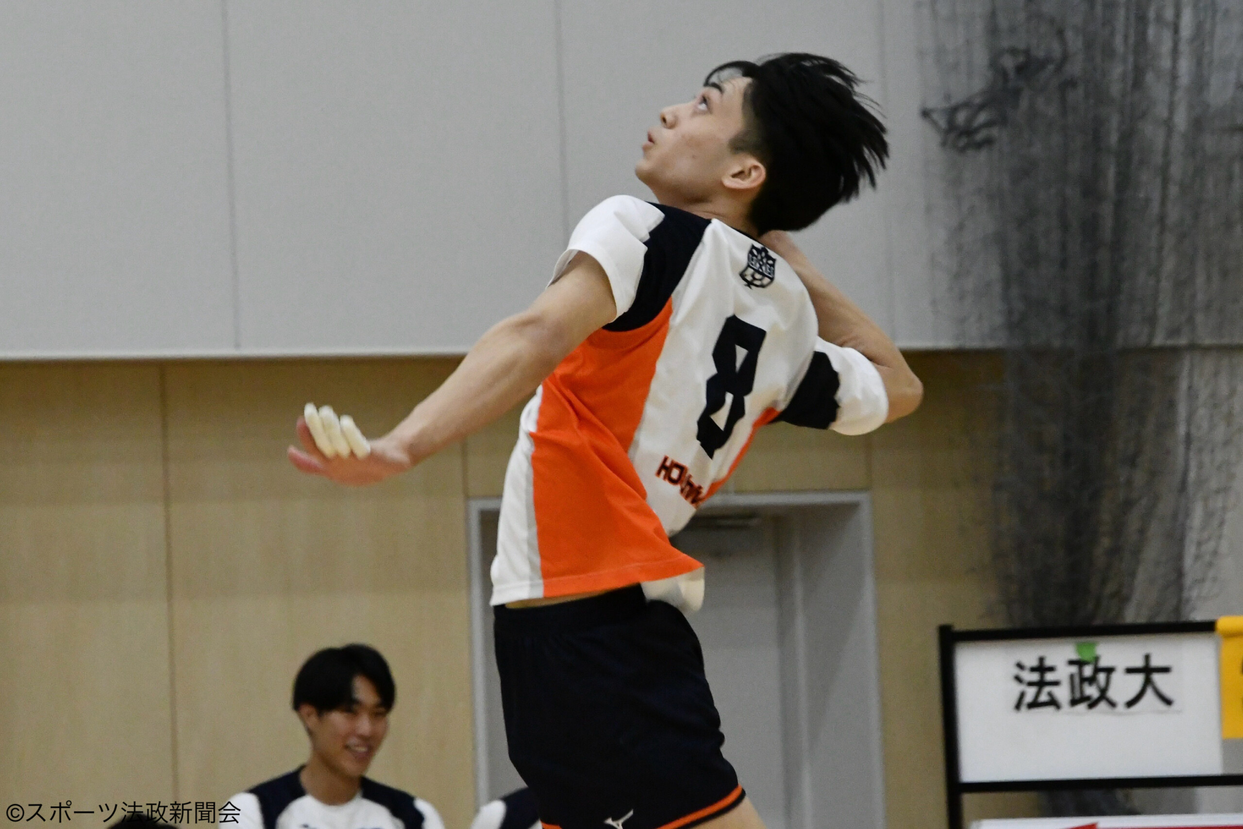 第1セット、序盤から追う展開となった法大はMB小田周平(営4)のサービスエースが決まり6-8とする。逆転を狙らう法大であったがサーブミスやレシーブミスが重なり6-14と大幅リードされる。終盤OH津末将生太(法1)の力強いスパイクで得点し追い上げを見せるも届かず22-25で第1セットを落とす。