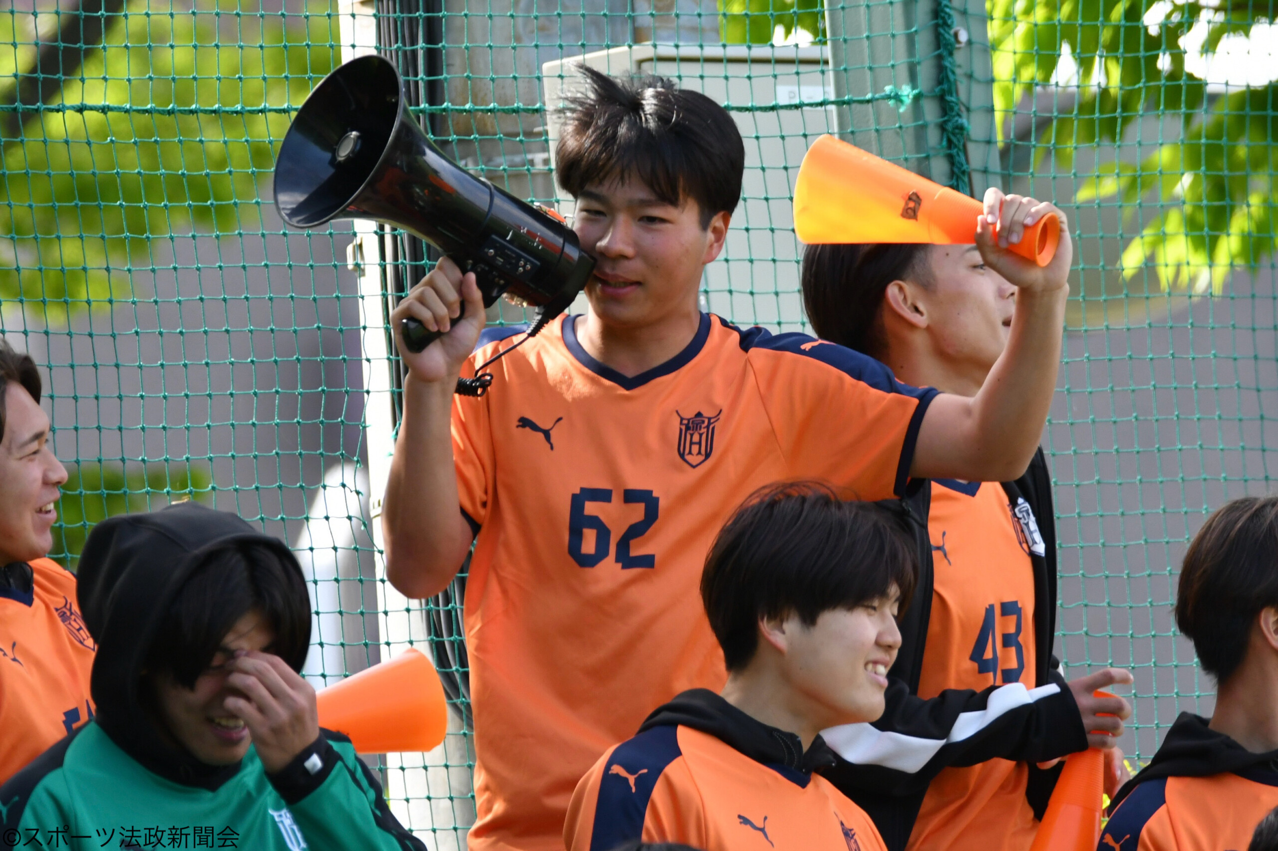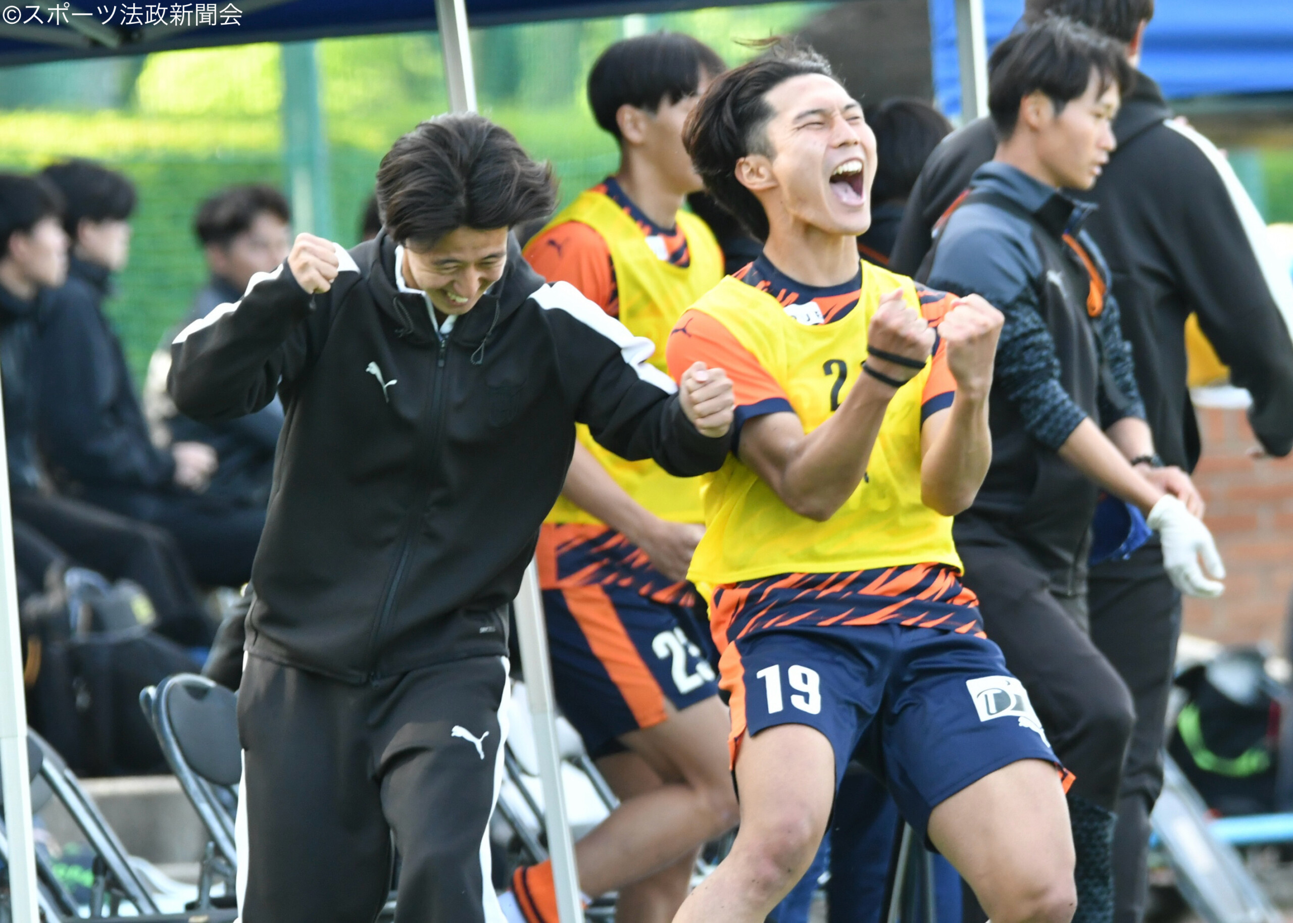 後半に入り追加点を狙う法大は、後半17分にクリアボールを拾った小池直矢(現4= 前橋育英・ジュビロ磐田内定)の華麗なタッチから菅原にスルーパスを送りチャンスを作るがこれはシュートまでいけず。また、中盤の守備や配球で峯野と根津元輝(経4= 前橋育英)が存在感を放つと、後半18分にはその峯野が中盤でボールを奪い、途中出場の松田悠世(社3=桐光学園)へと繋ぎその松田が左足で強烈なシュートを放つもキーパー正面に飛んでしまいゴールはならず。すると徐々に相手がギアを上げ、劣勢の時間が多くなると、後半21分、22分と立て続けにピンチを迎えるが、ここも寺田のビッグセーブで耐え凌ぐ。その後も劣勢の時間が続く中後半34分には峯野がこの試合2枚目のイエローカードで退場処分となる。1人少ない状況となった法大はその後も相手の猛攻を受けるが、途中出場の選手を含めた全員のハードワークで前半の1点を守り切り、ウノゼロで今季リーグ戦初勝利を飾った。