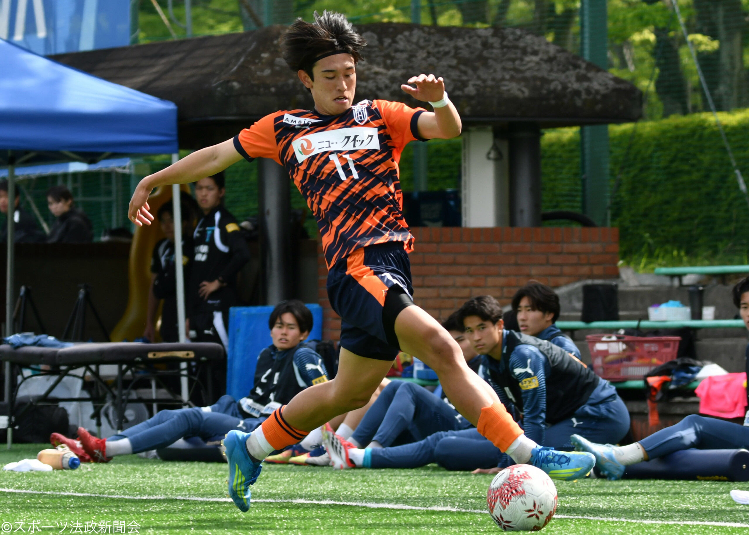 序盤から法大は繋ぐ筑波に対して前線からの守備を行うと前半19分、前線のプレスから中盤で峯野倖(経2=市立船橋)がボールを奪い、頂点の菅原太一(スポ3=浜松開誠館)へと繋ぐと前を向いた菅原がシュートを放つ、これはディフェンダーのブロックに遭うが、こぼれ球を再び菅原が拾いエリア手前から右足を振るとこれが相手のディフェンダーに当たりゴールに吸い込まれ、先制に成功する。その後は筑波大の鋭い攻撃に苦しめられ、前半終盤には決定的な場面を作られるが、畑野や寺田周太(経4=法政二)を中心とした集中した守備で前半をリードして終える。