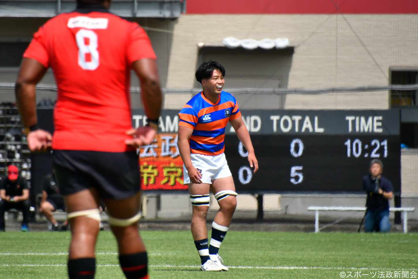 後半も苦しい展開が続く。開始1分でトライを許すと、帝京大のフィジカルとスピードの前に防戦一方となり、立て続けに失点した。一矢を報いたい法大は16分に、相手の反則からゴール前ラインアウトに持ち込み、モールからHO花澤祐太(3)が飛び出すも、勢いあるディフェンスに阻まれ得点には至らない。