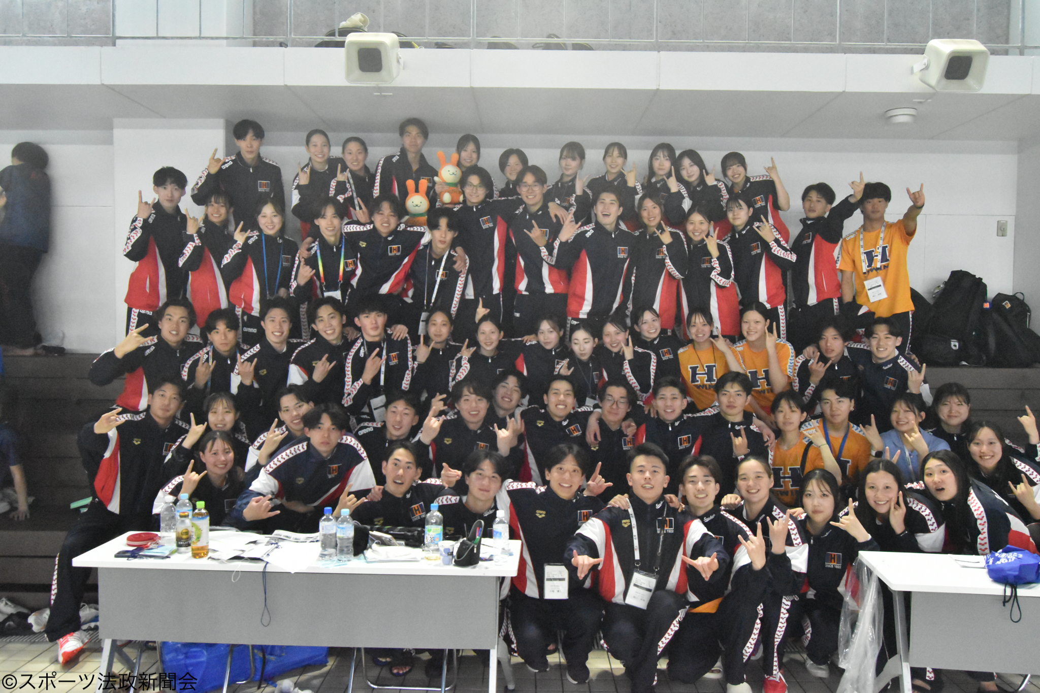 1日で多くの種目が行われる過酷なスケジュールの中、法大スイマーたちは次々と自己ベストを更新。合計9種目で頂点に立った。中でも女子フリーリレーでは、明治大学との熱戦を制し、優勝を掴み取った。